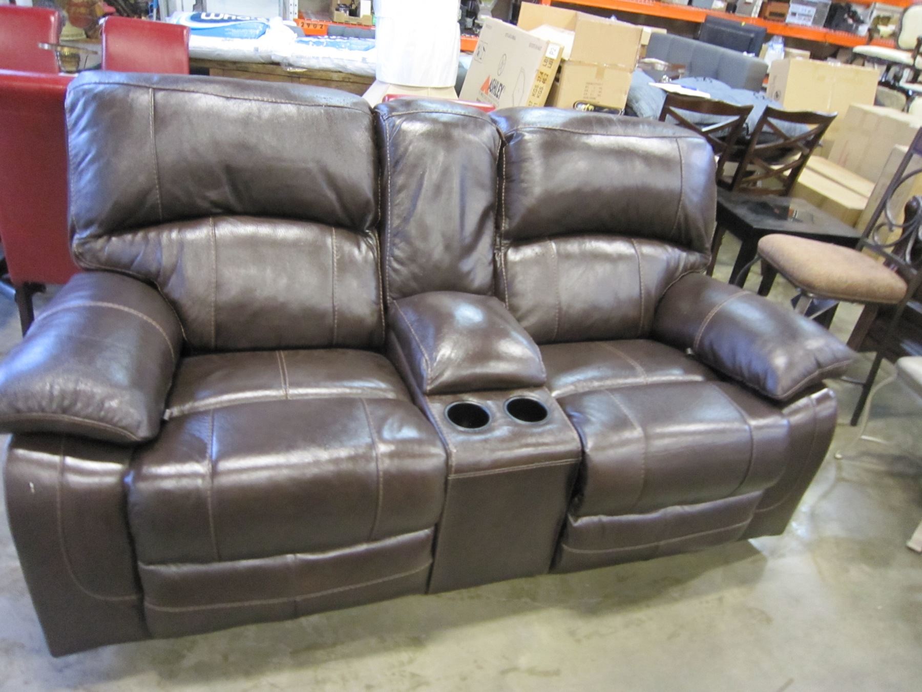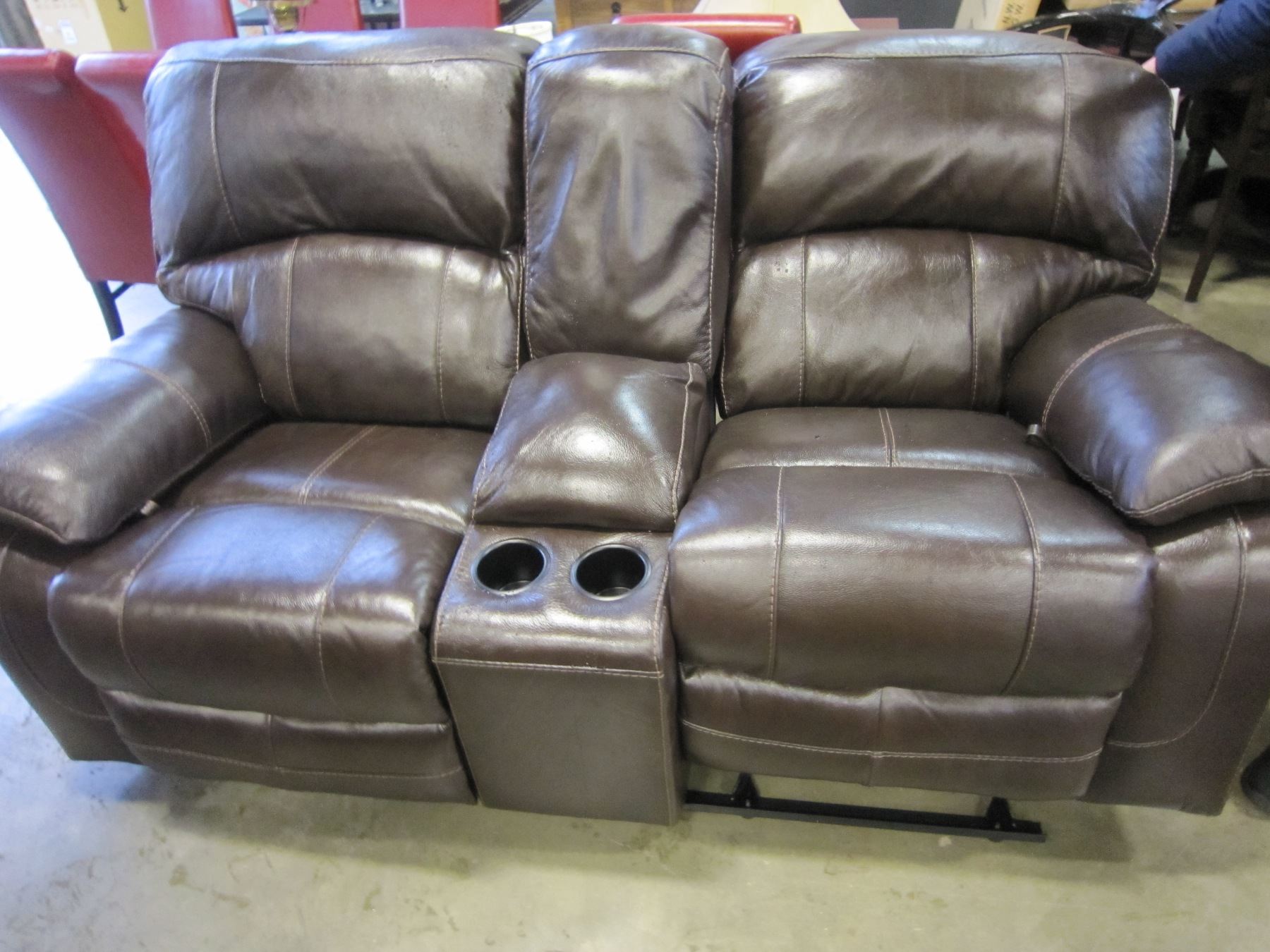 ASHLEY BROWN STITCHED LEATHER GLIDER RECLINING LOVESEAT WITH CONSOLE, RETAIL $3299, FLOOR MODEL