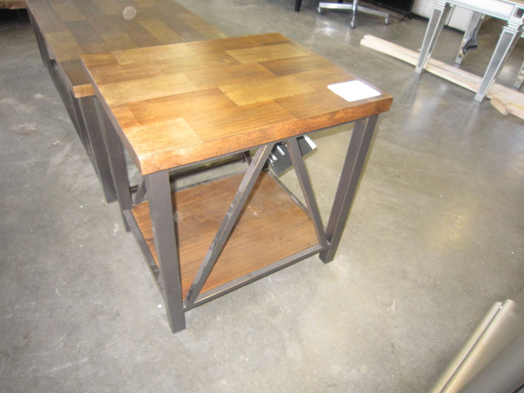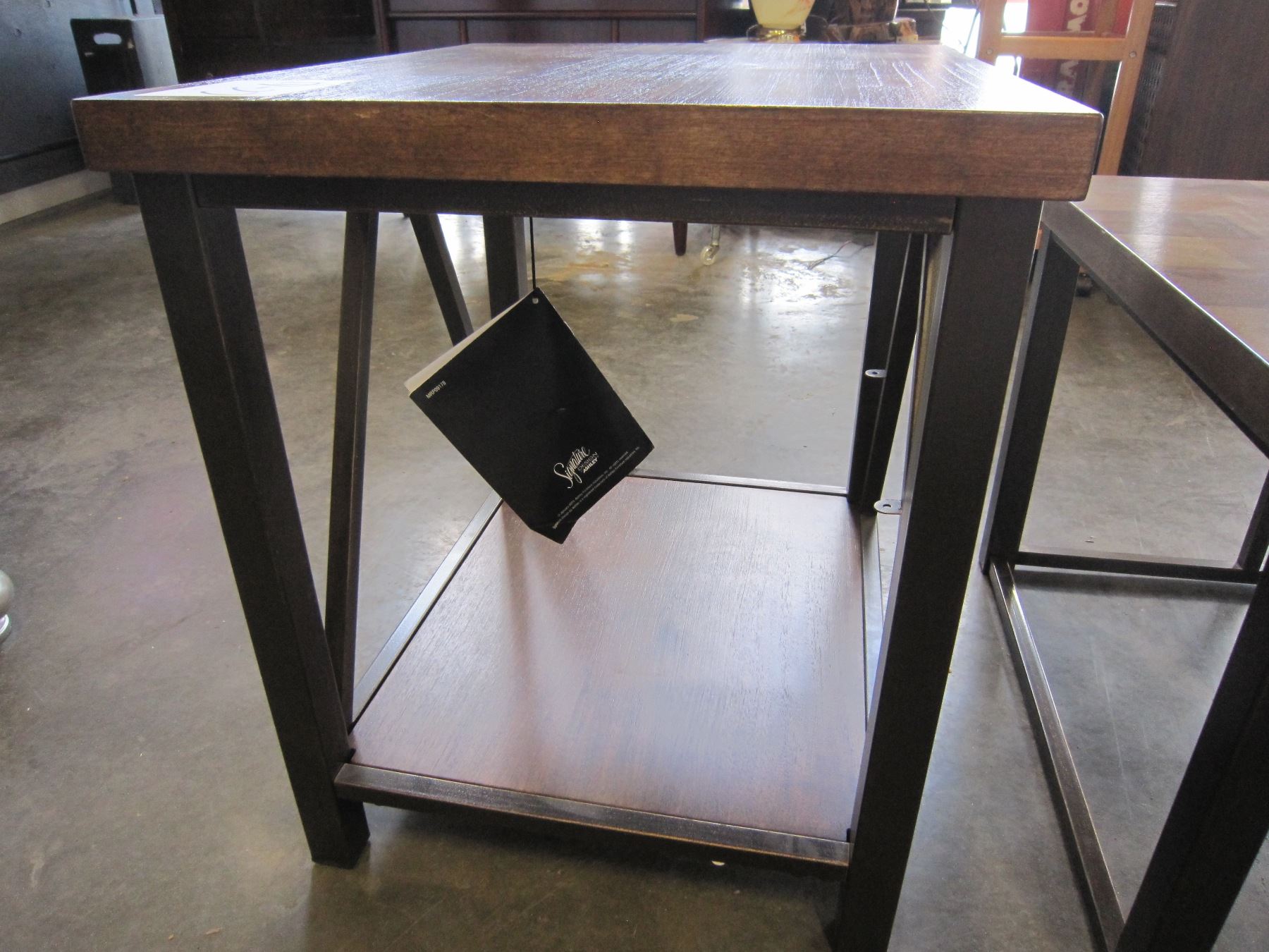 ASHLEY FLOOR MODEL 2 PIECE WOOD TOP MODERN COFFEE AND ENDTABLE SET, RETAIL $899