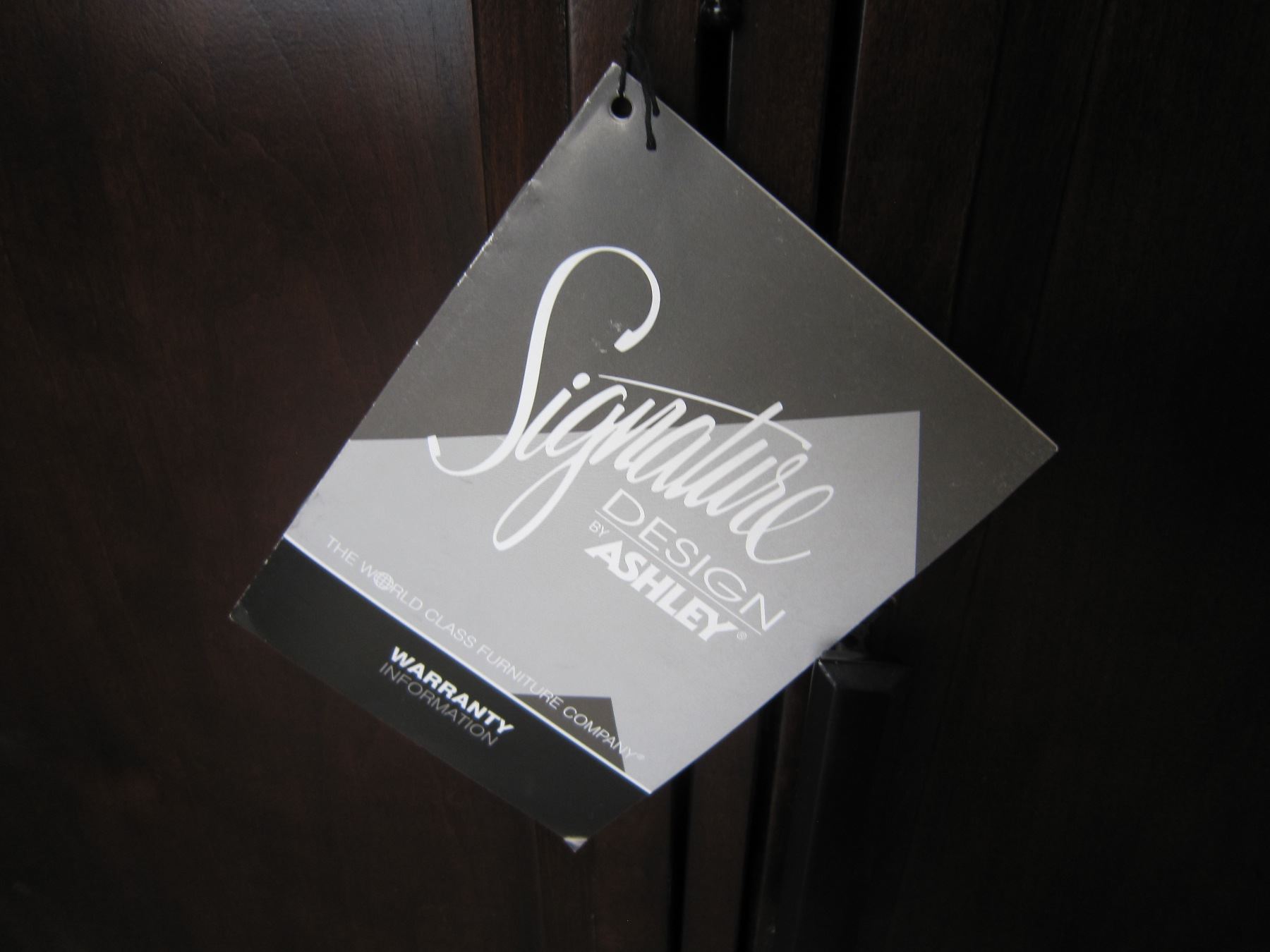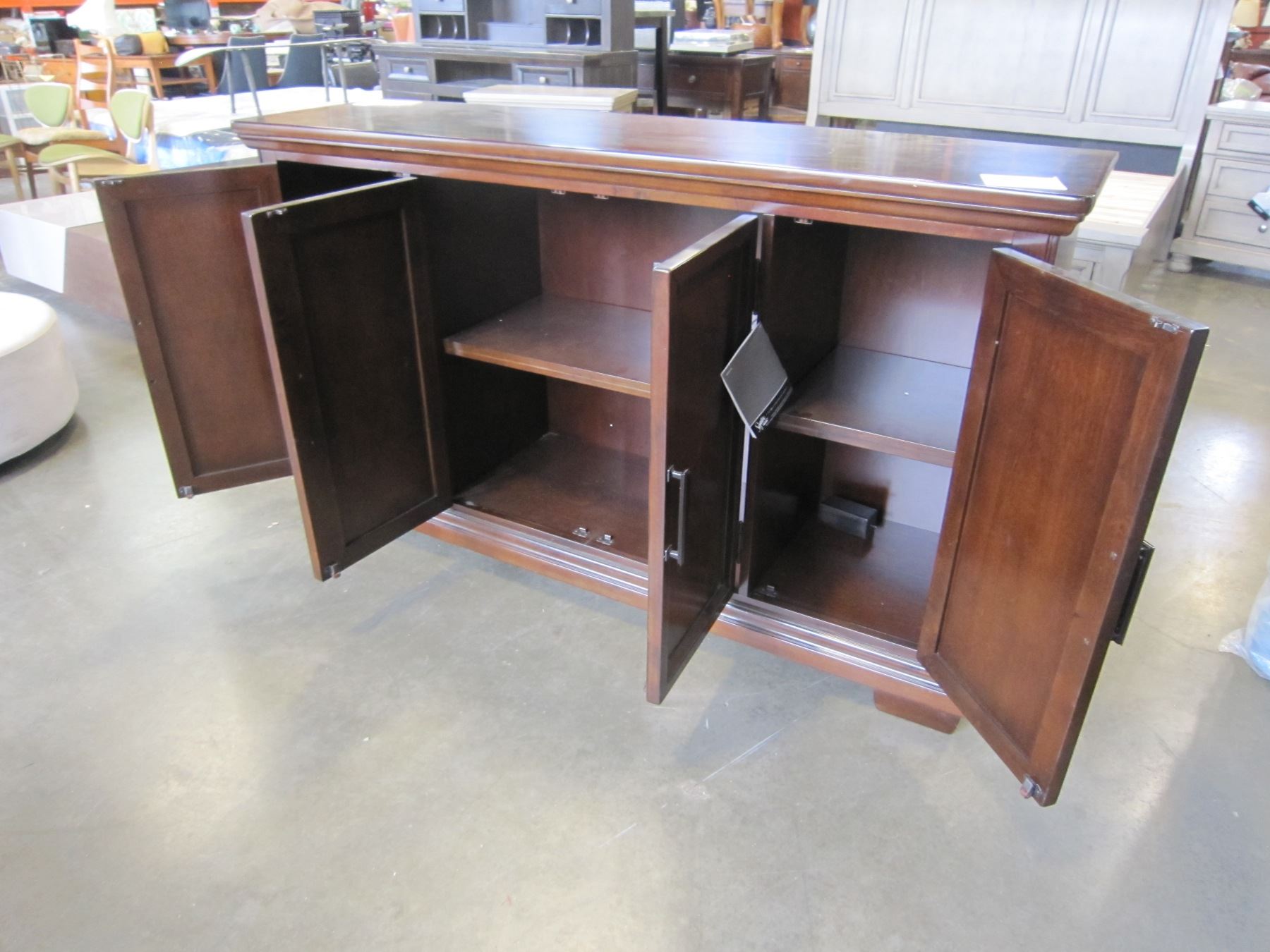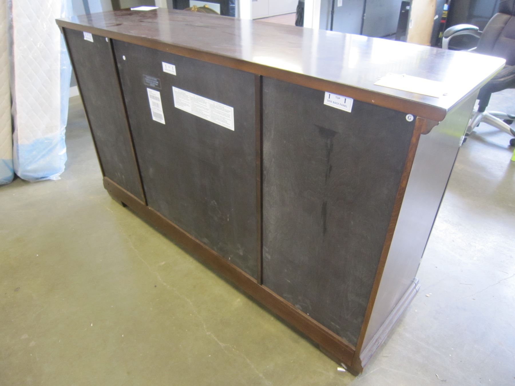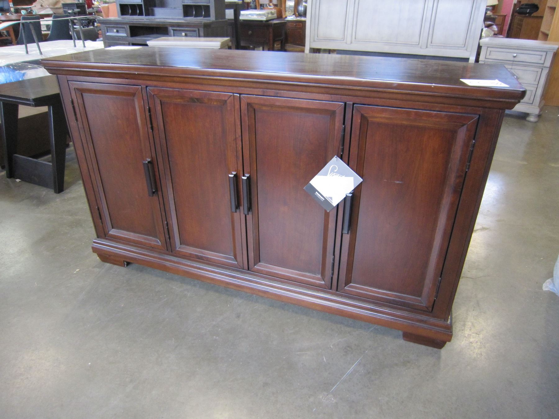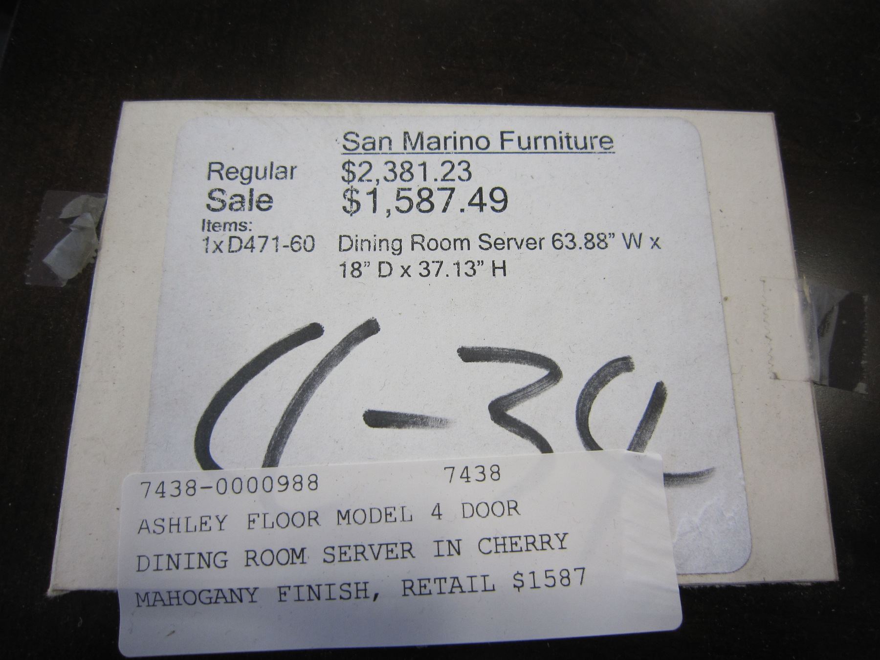 ASHLEY FLOOR MODEL 4 DOOR DINING ROOM SERVER IN CHERRY MAHOGANY FINISH, RETAIL $1587