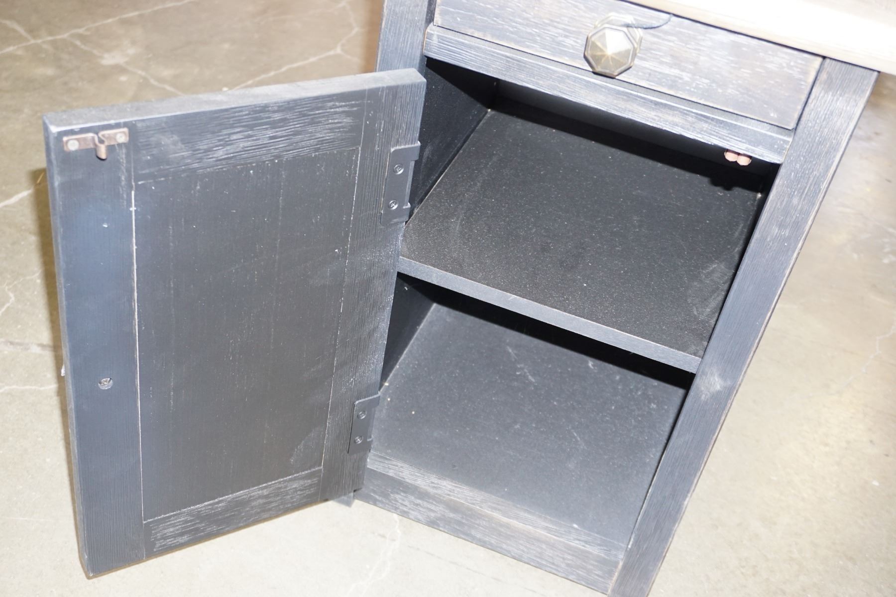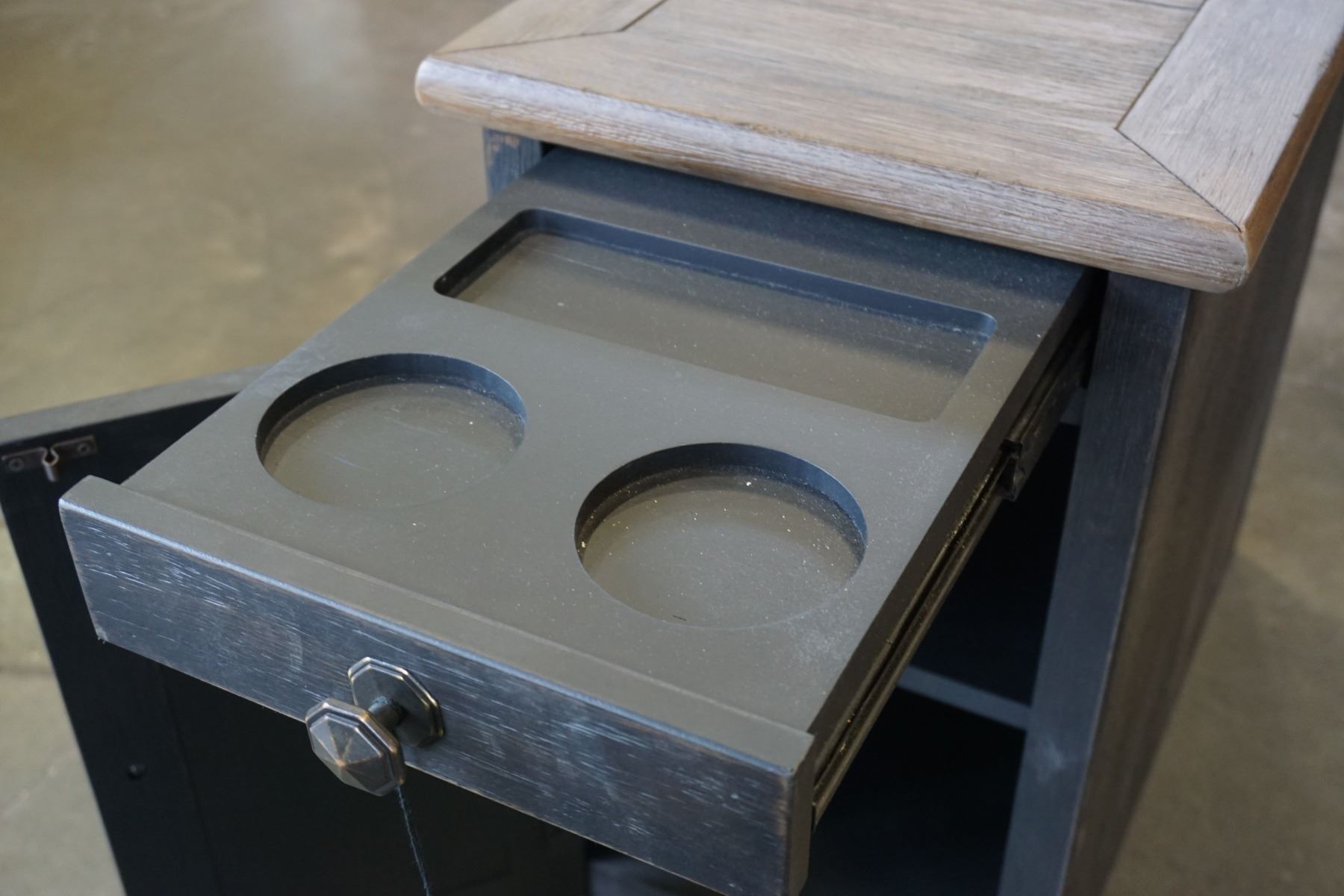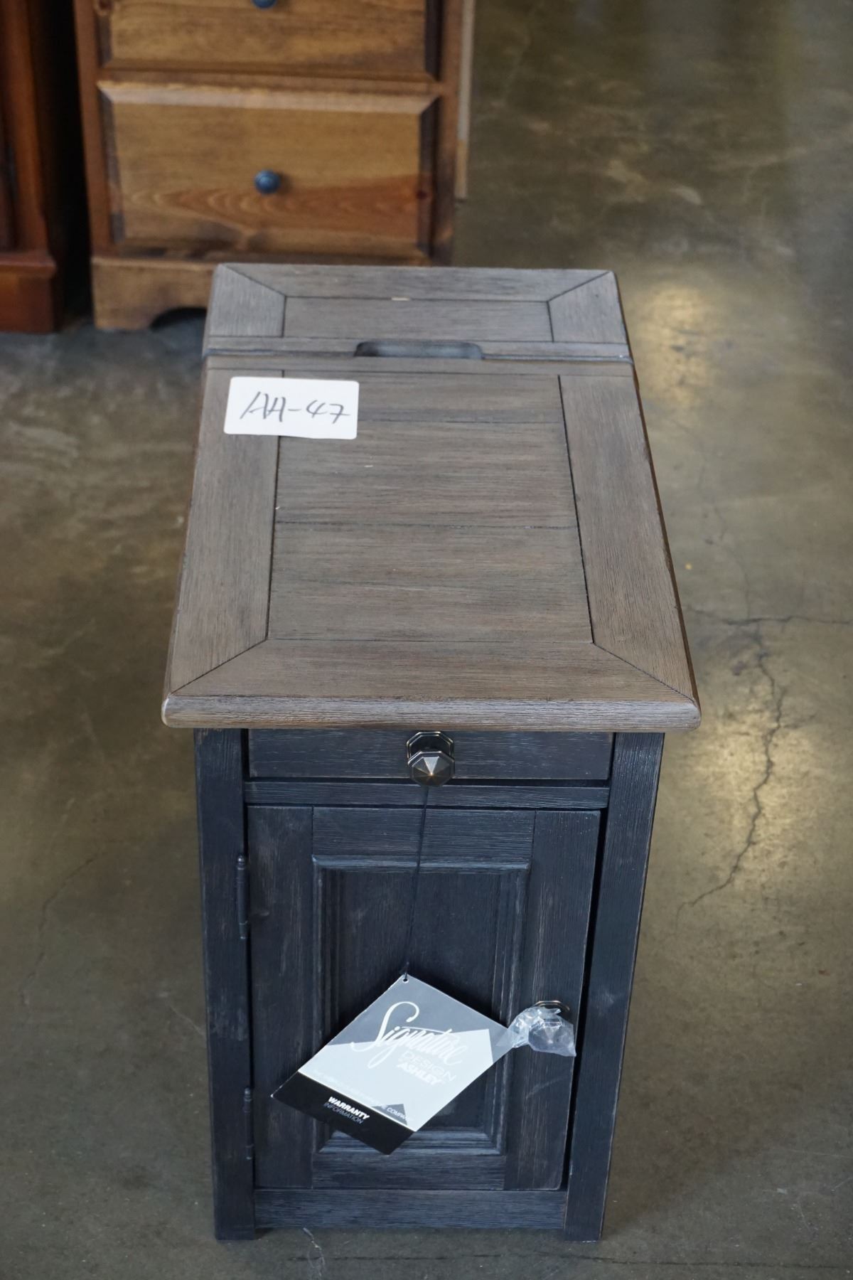 ASHLEY FLOOR MODEL BLACK CHAIR SIDE ENDTABLE, WITH NATURAL WOOD TOP AND POWER/USB, RETAIL $499
