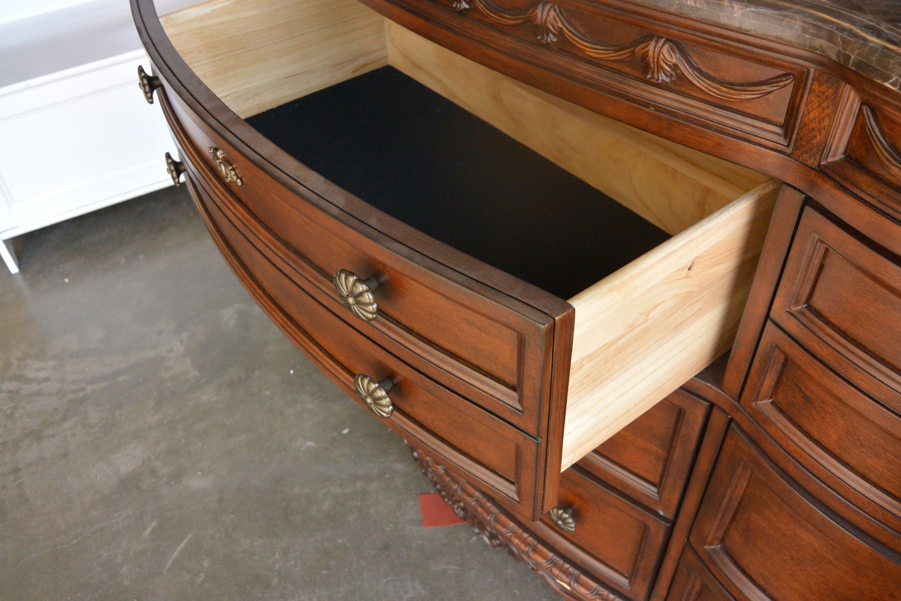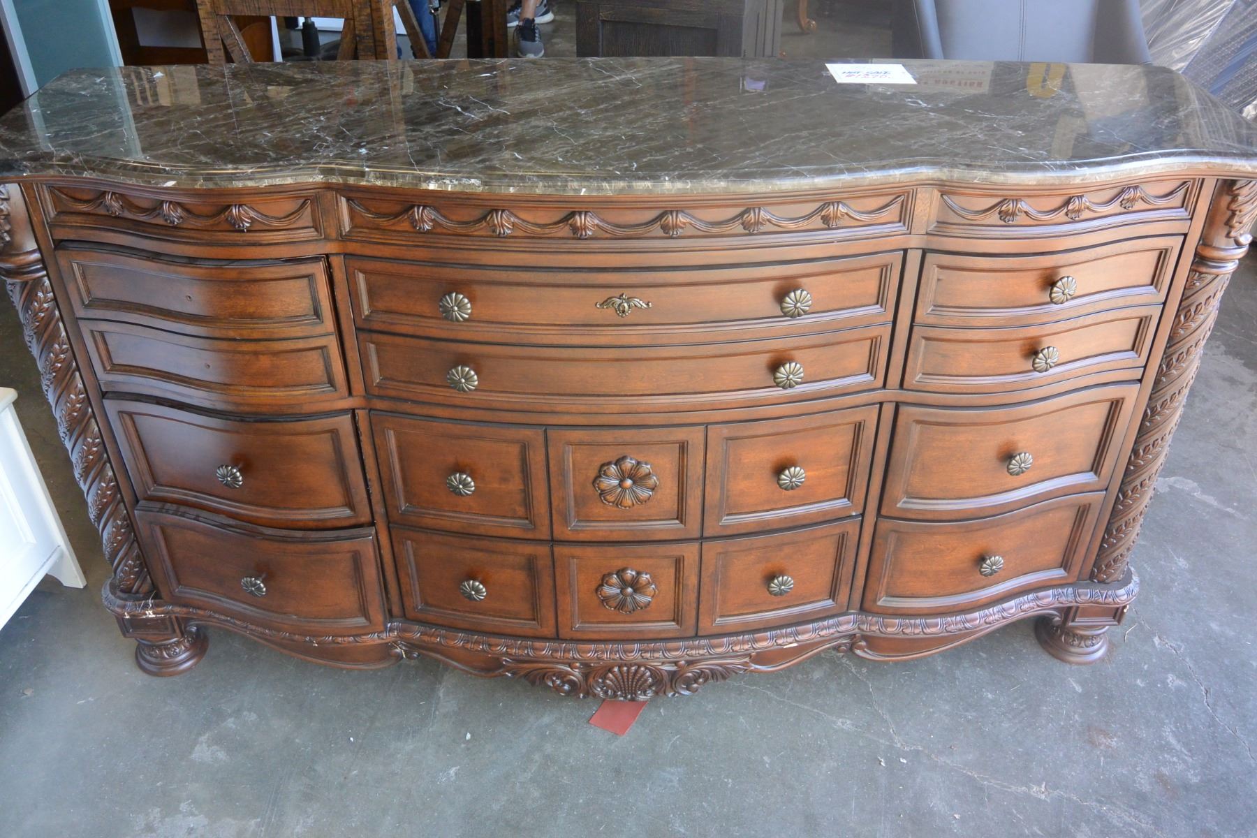 ASHLEY FLOOR MODEL CARVED FAUX MARBLE TOP DRESSER RETAIL $2574, MINOR COSMETIC DAMAGE