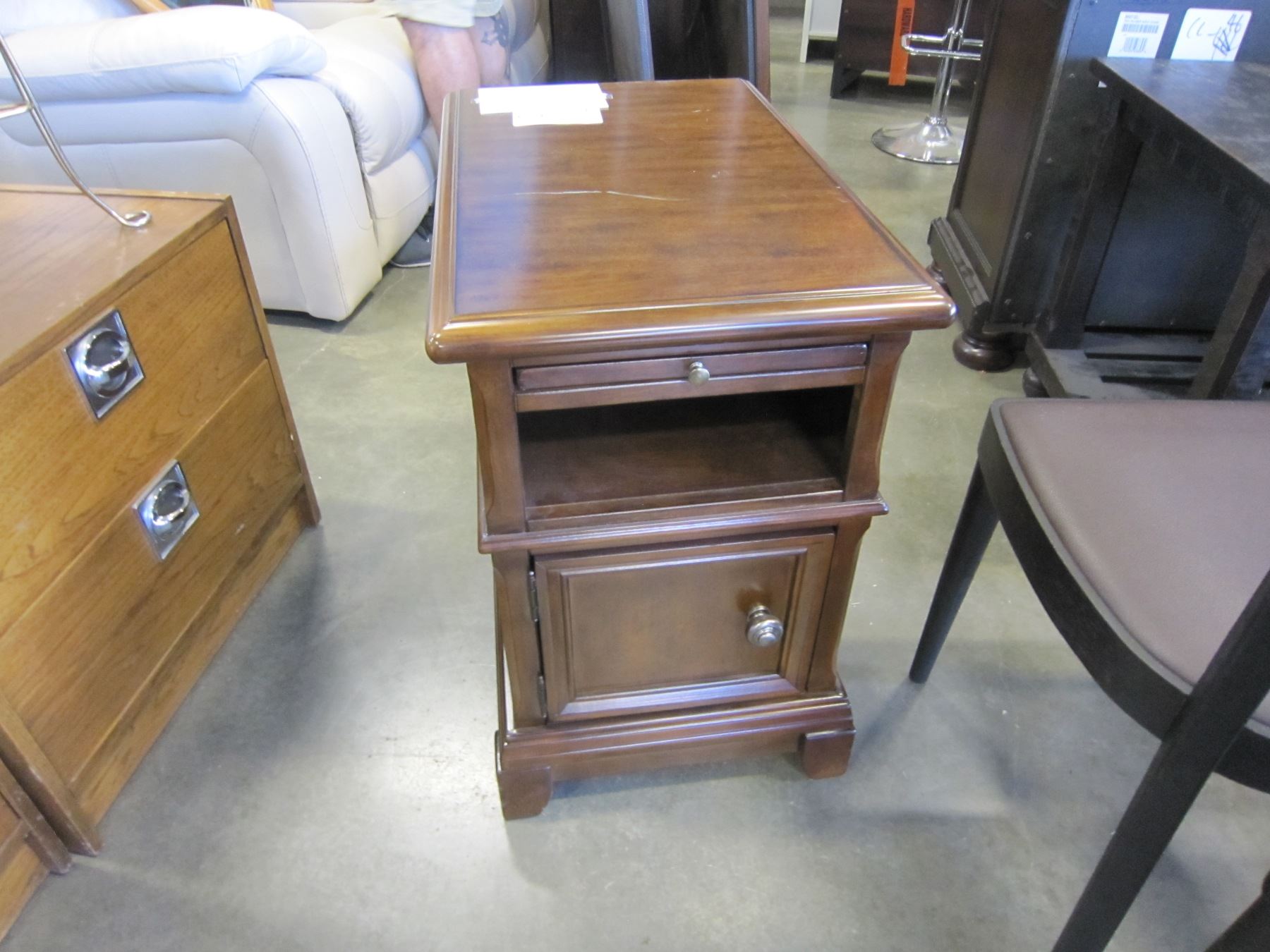 ASHLEY FLOOR MODEL CHAIR SIDE ENDTABLE WITH DOOR AND PULL OUT TRAY, RETAIL $449