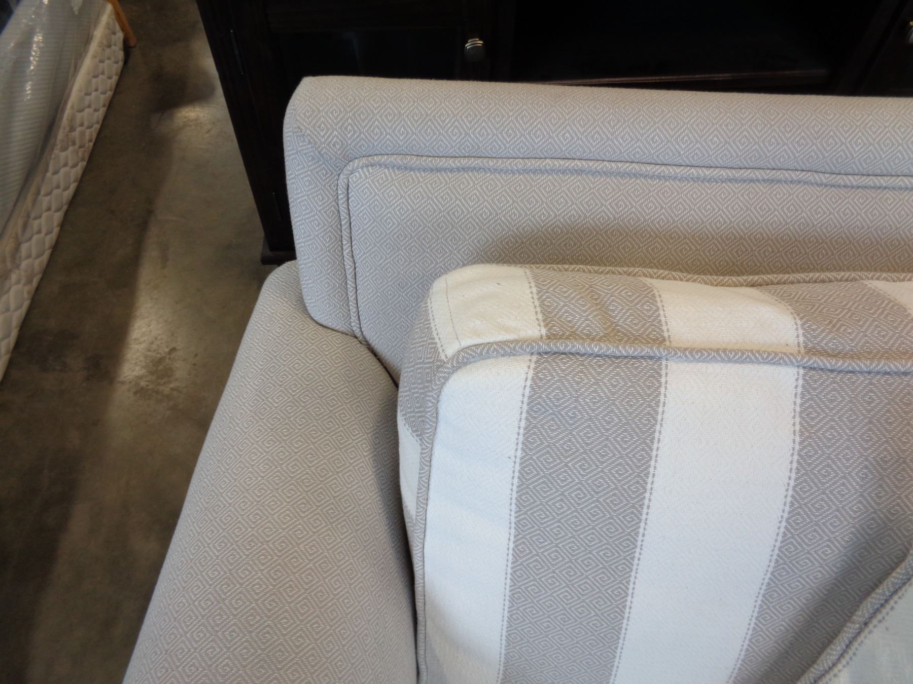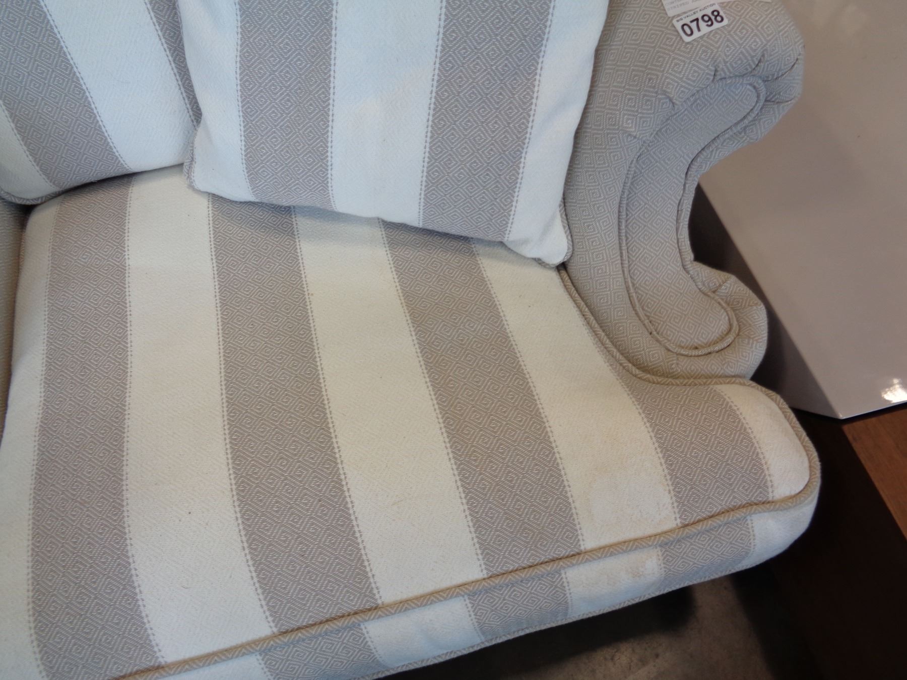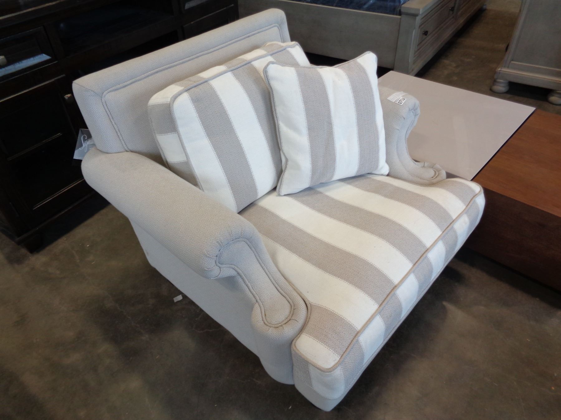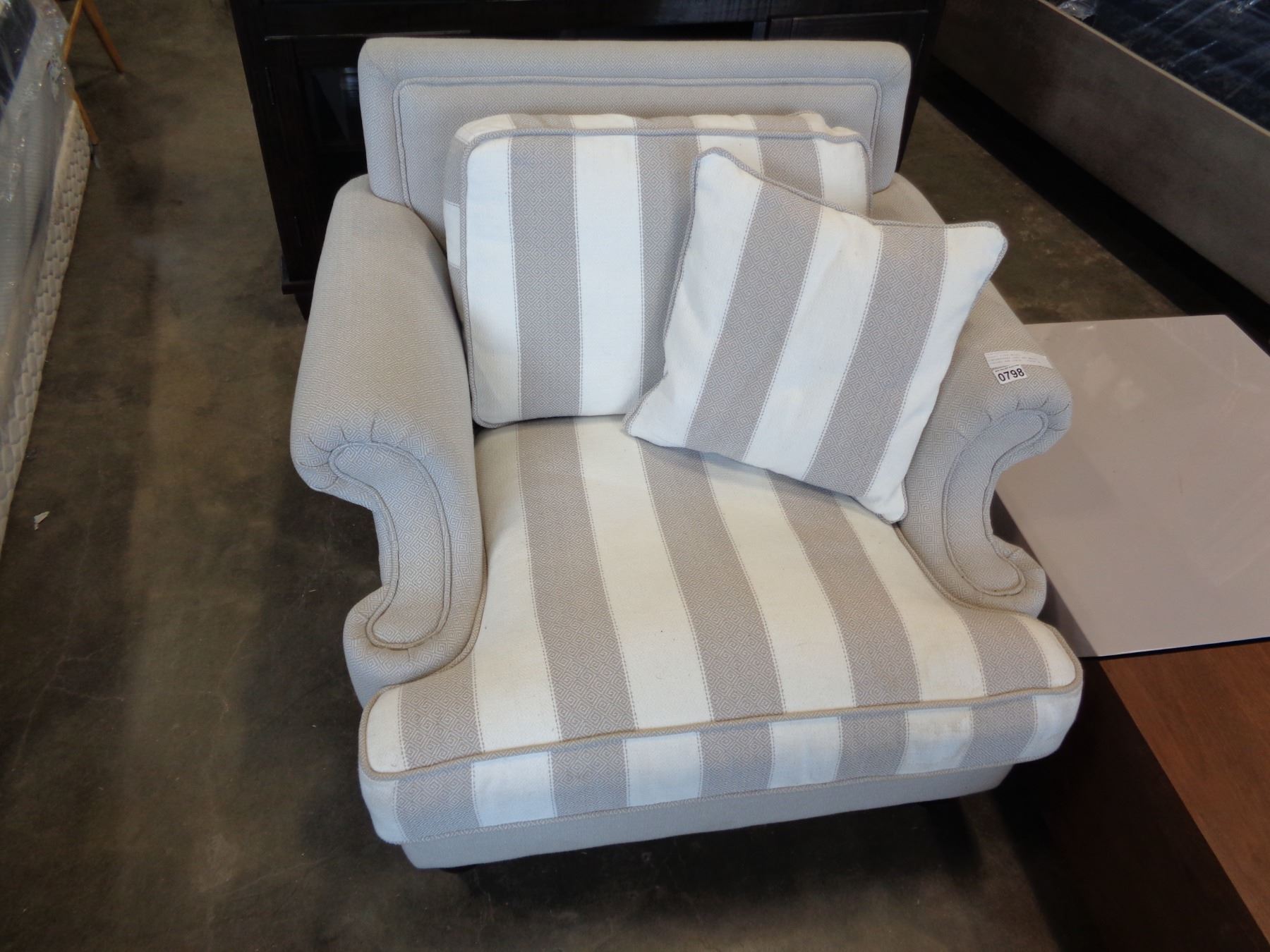 ASHLEY FLOOR MODEL CONTEMPORARY GREY AND WHITE STRIPED ARM CHAIR - STAIN ON CORNER OF SEAT CUSHION