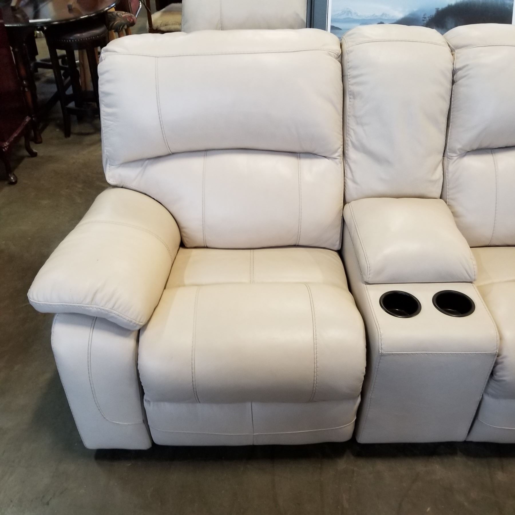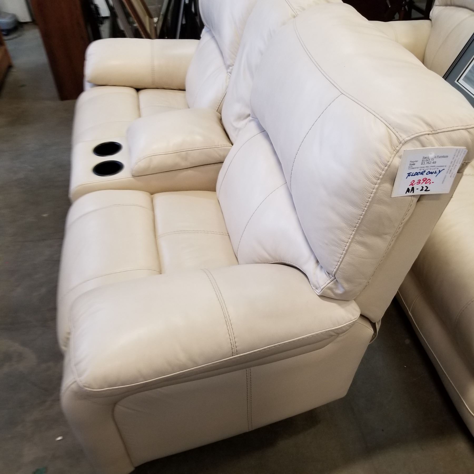 ASHLEY FLOOR MODEL CREAM GENUINE LEATHER POWER RECLINING AND ROCKING LOVESEAT WITH CONSOLE RETAIL $2699