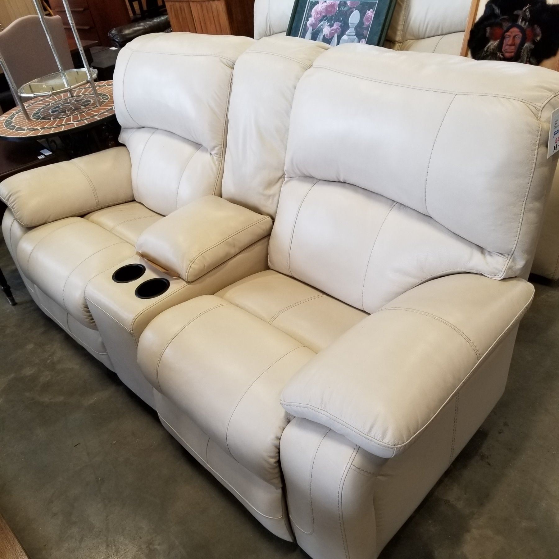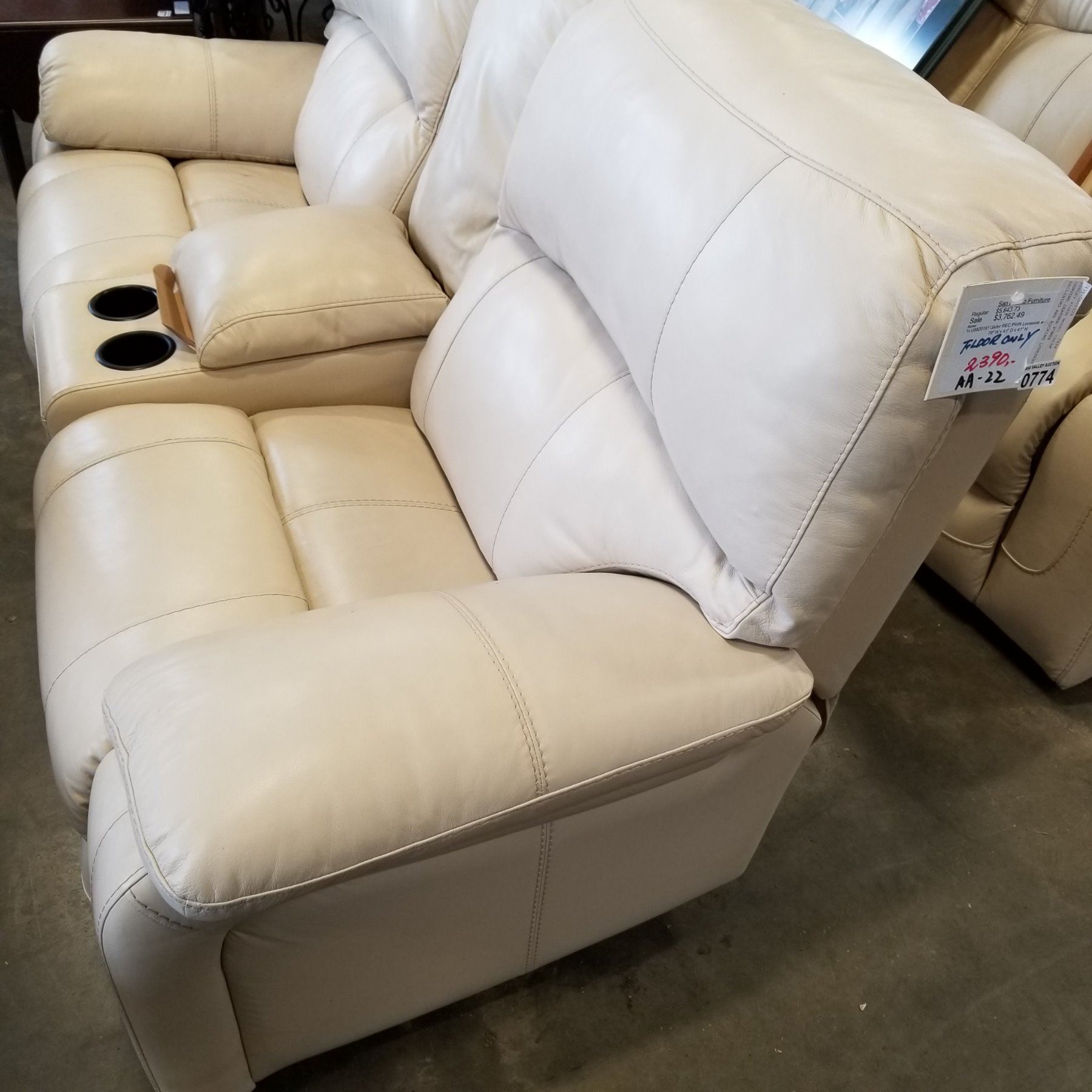 ASHLEY FLOOR MODEL CREAM GENUINE LEATHER POWER RECLINING AND ROCKING LOVESEAT WITH CONSOLE RETAIL $2699