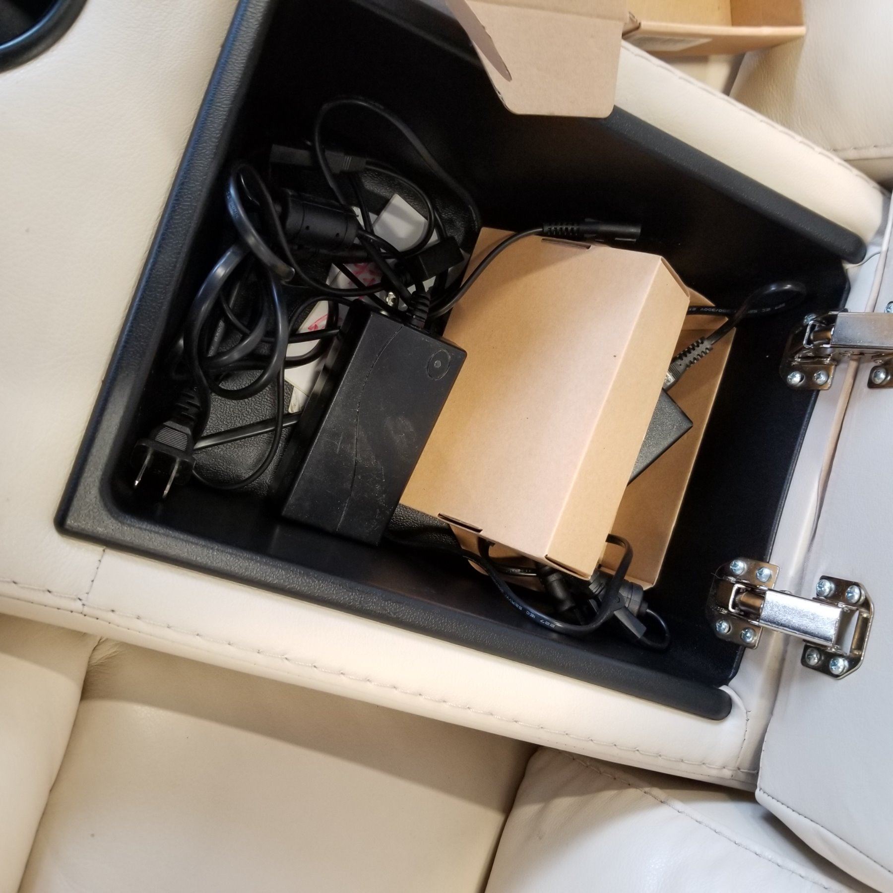 ASHLEY FLOOR MODEL CREAM GENUINE LEATHER POWER RECLINING AND ROCKING LOVESEAT WITH CONSOLE RETAIL $2