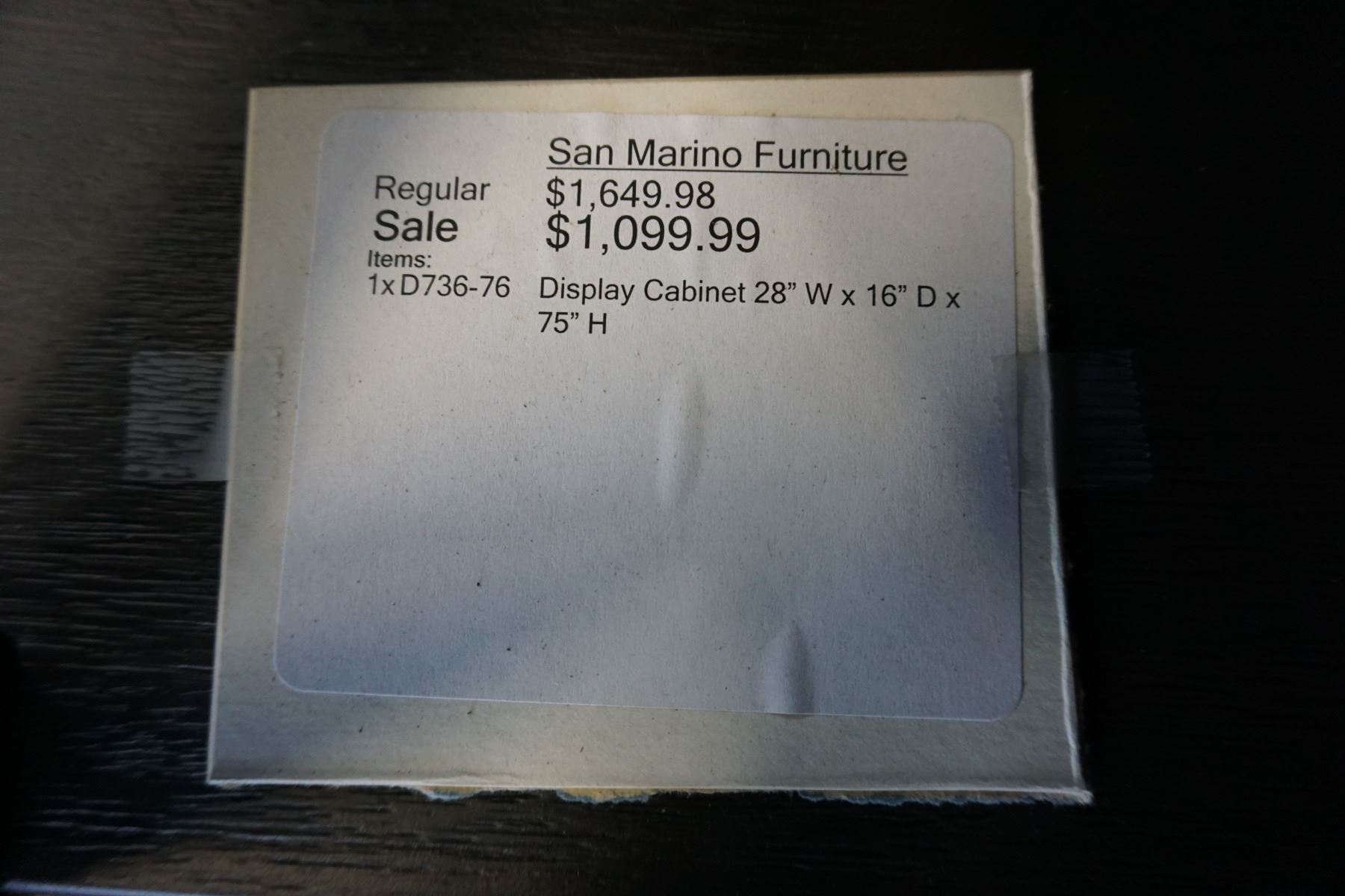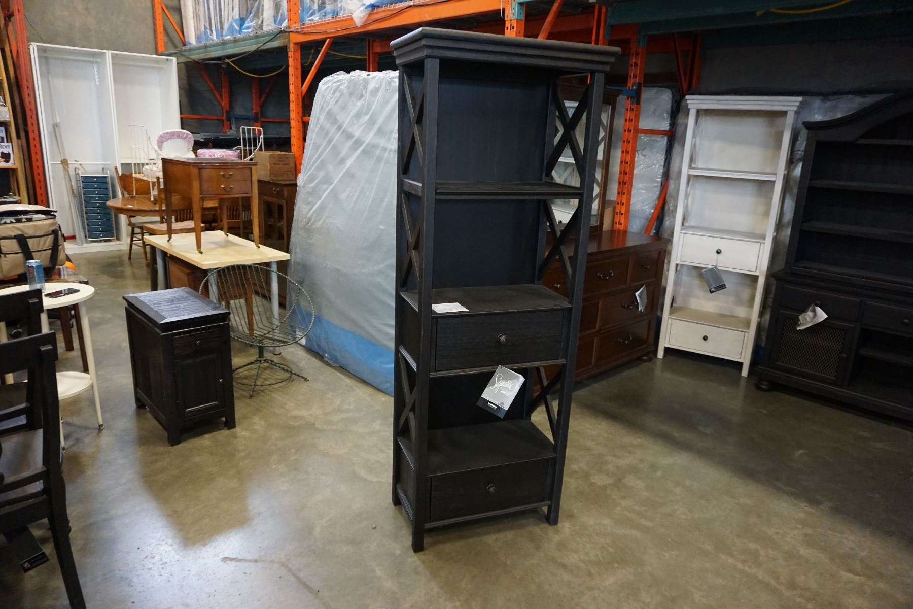ASHLEY FLOOR MODEL DARK RUSTIC WOOD DISPLAY CABINET WITH DRAWER, 75 INCH TALL, RETAIL $1,099