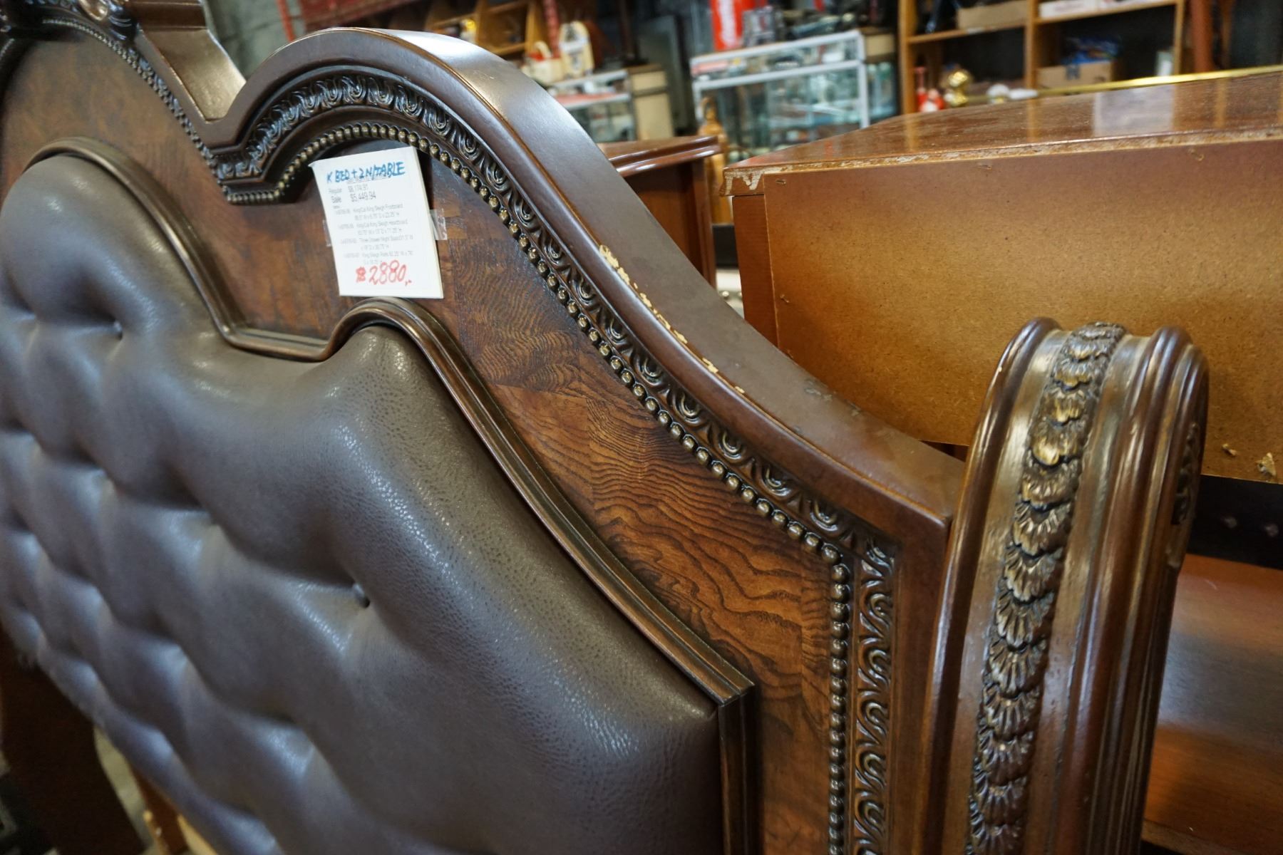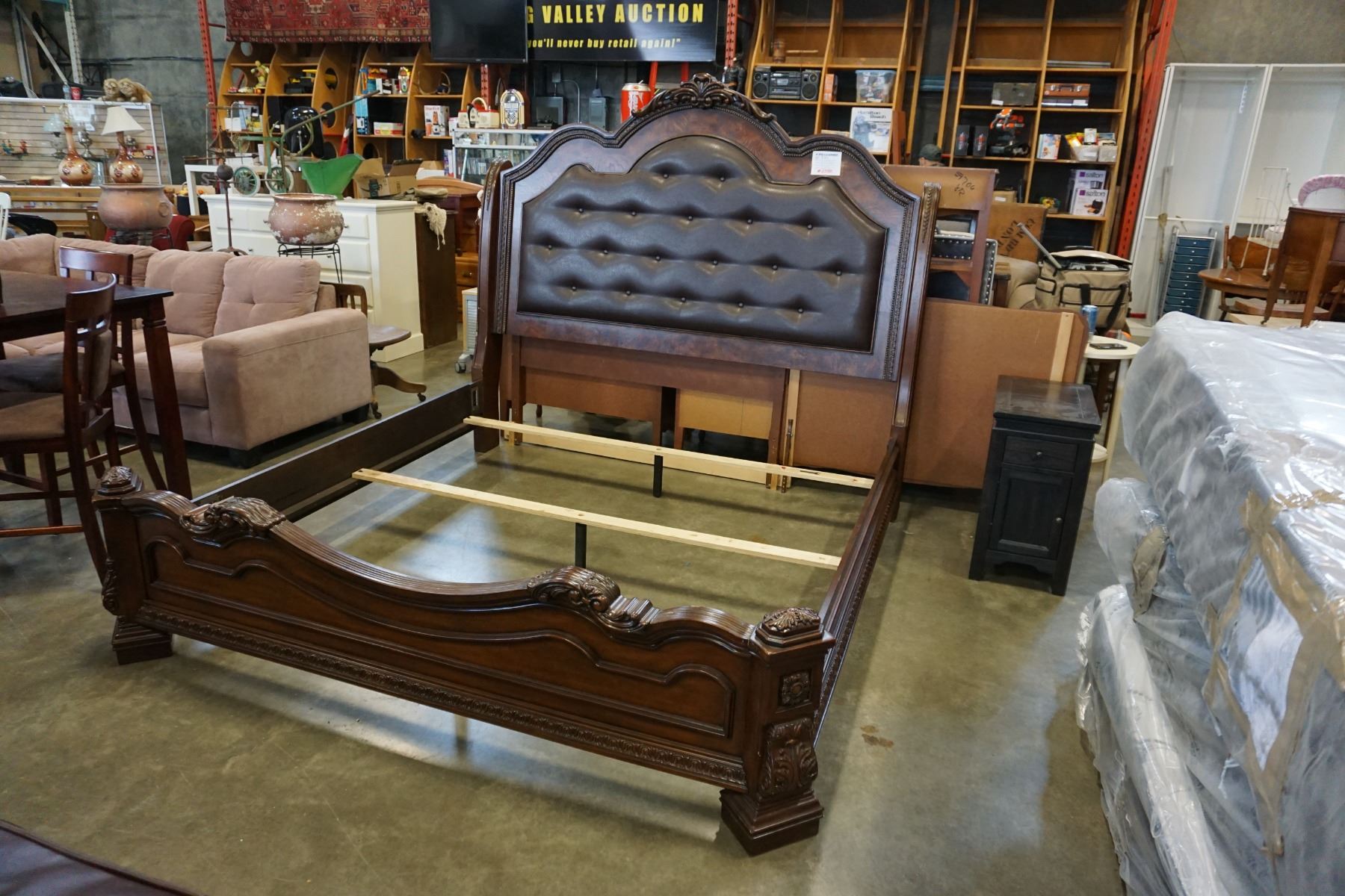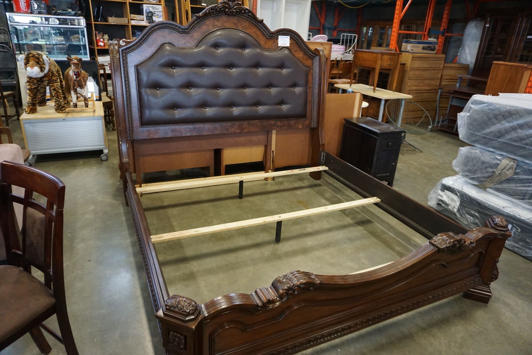 ASHLEY FLOOR MODEL KINGSIZE DARK CARVED SLEIGH BEDFRAME WITH BROWN LEATHER TUFTED INSERT, RETAIL $2889
