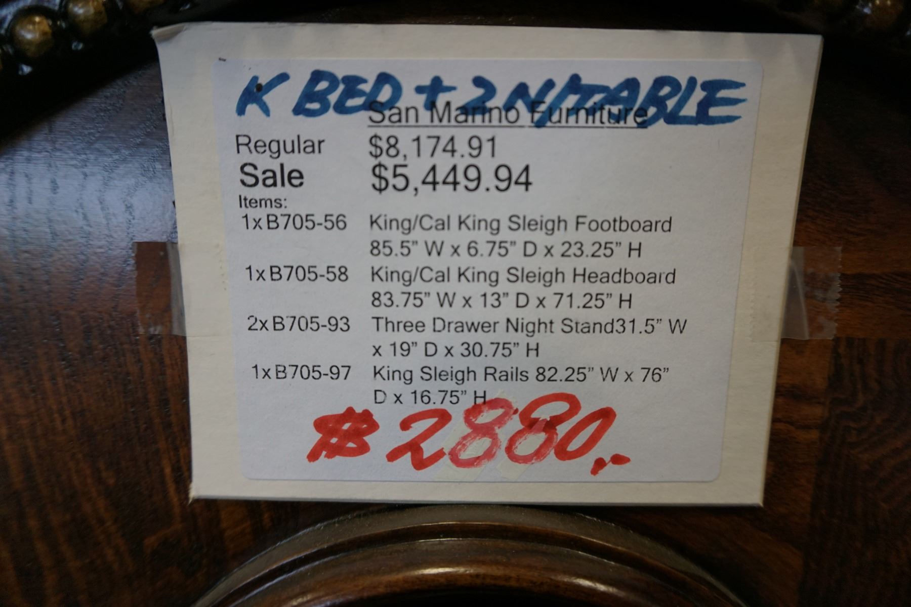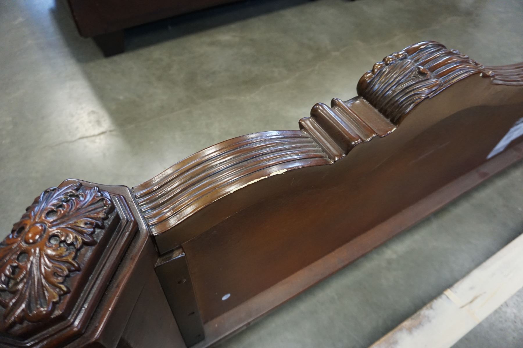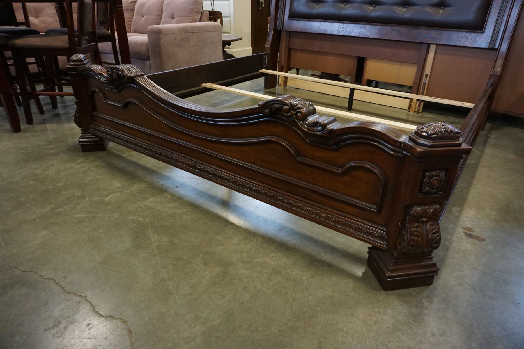 ASHLEY FLOOR MODEL KINGSIZE DARK CARVED SLEIGH BEDFRAME WITH BROWN LEATHER TUFTED INSERT, RETAIL $28
