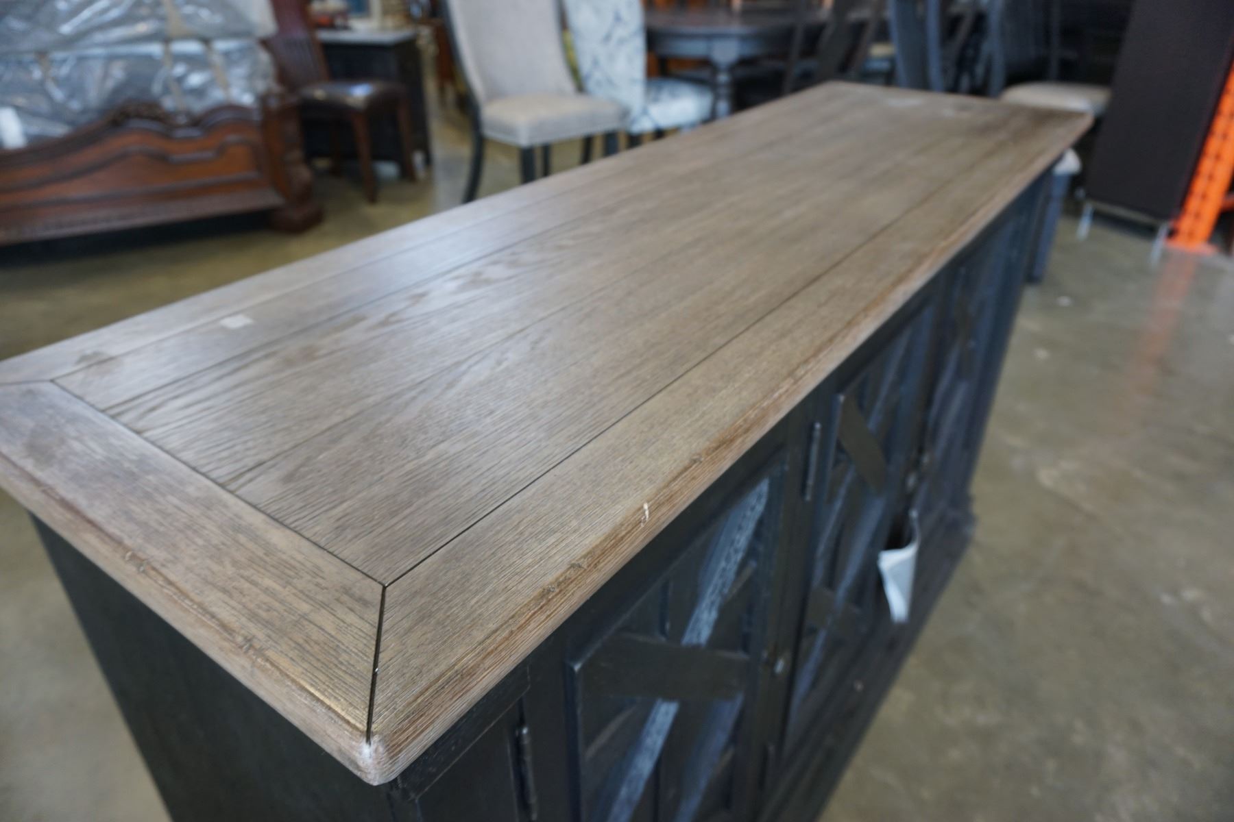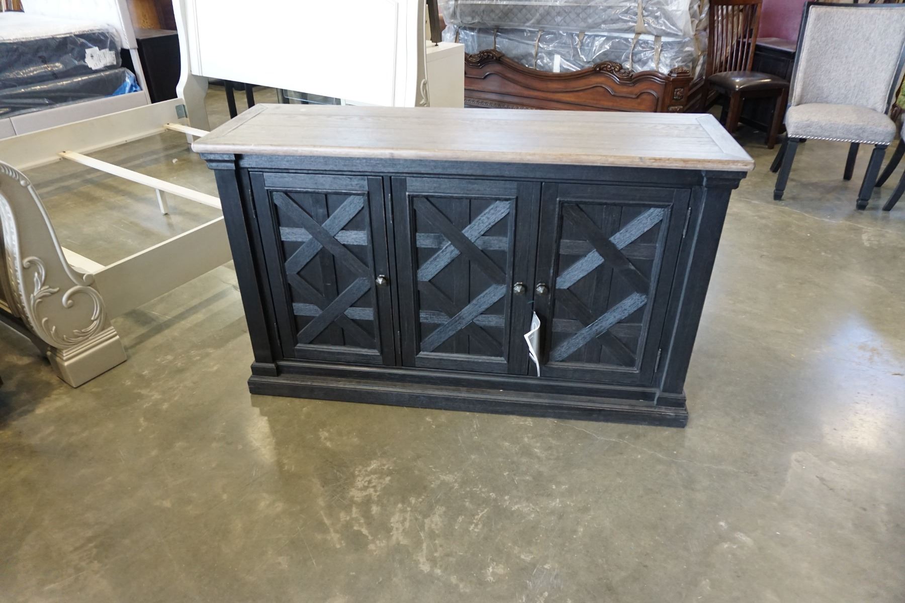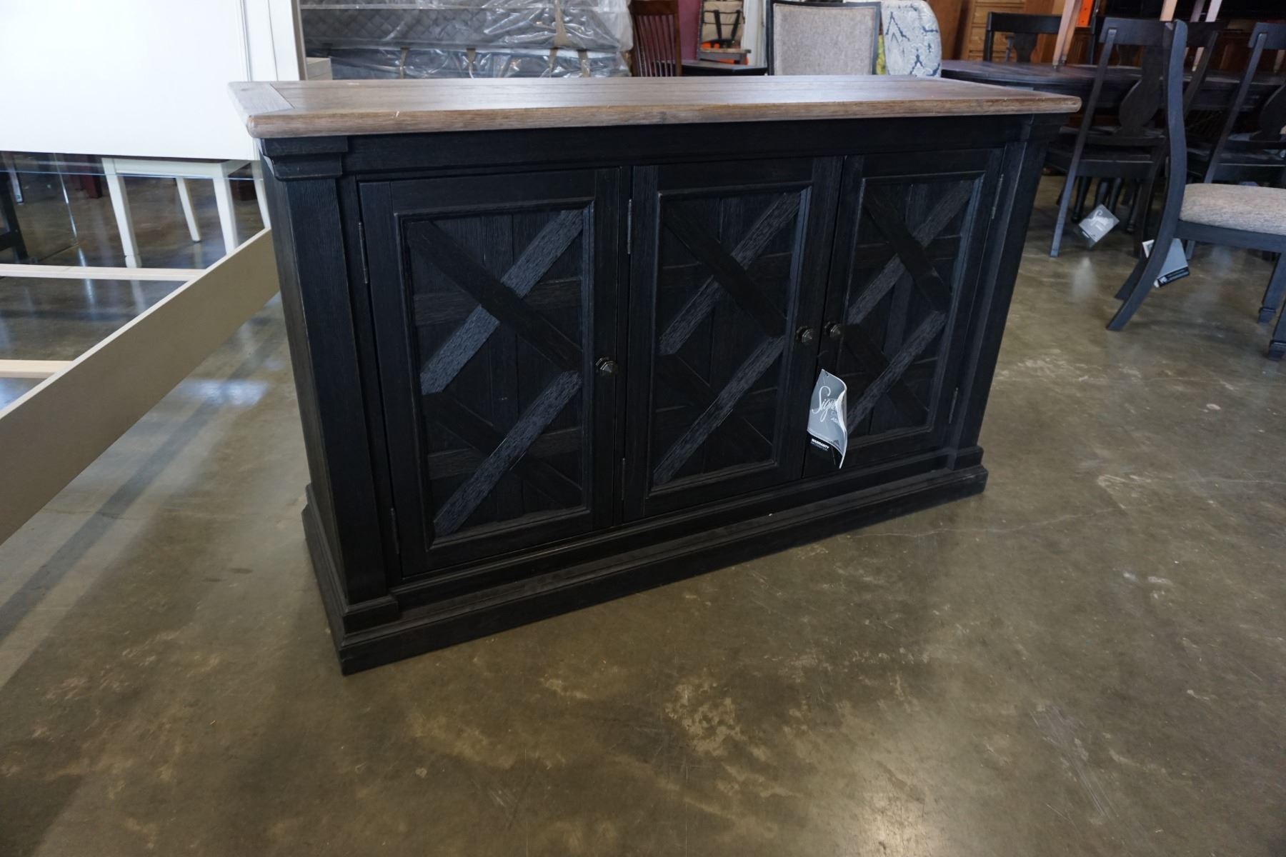 ASHLEY FLOOR MODEL NATURAL WOOD TOP FARMHOUSE SERVING CABINET, WITH 3 DOORS, RETAIL $1899