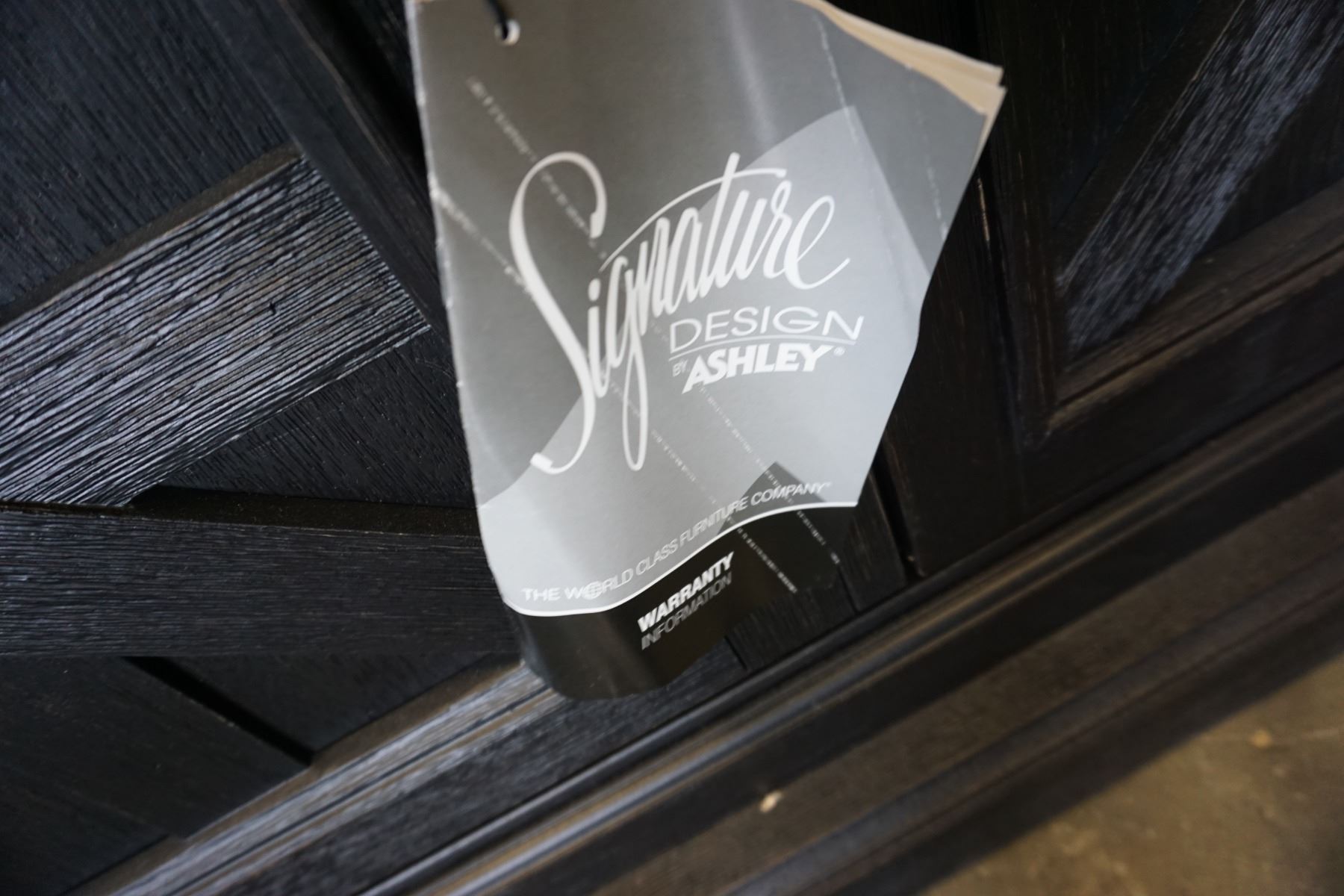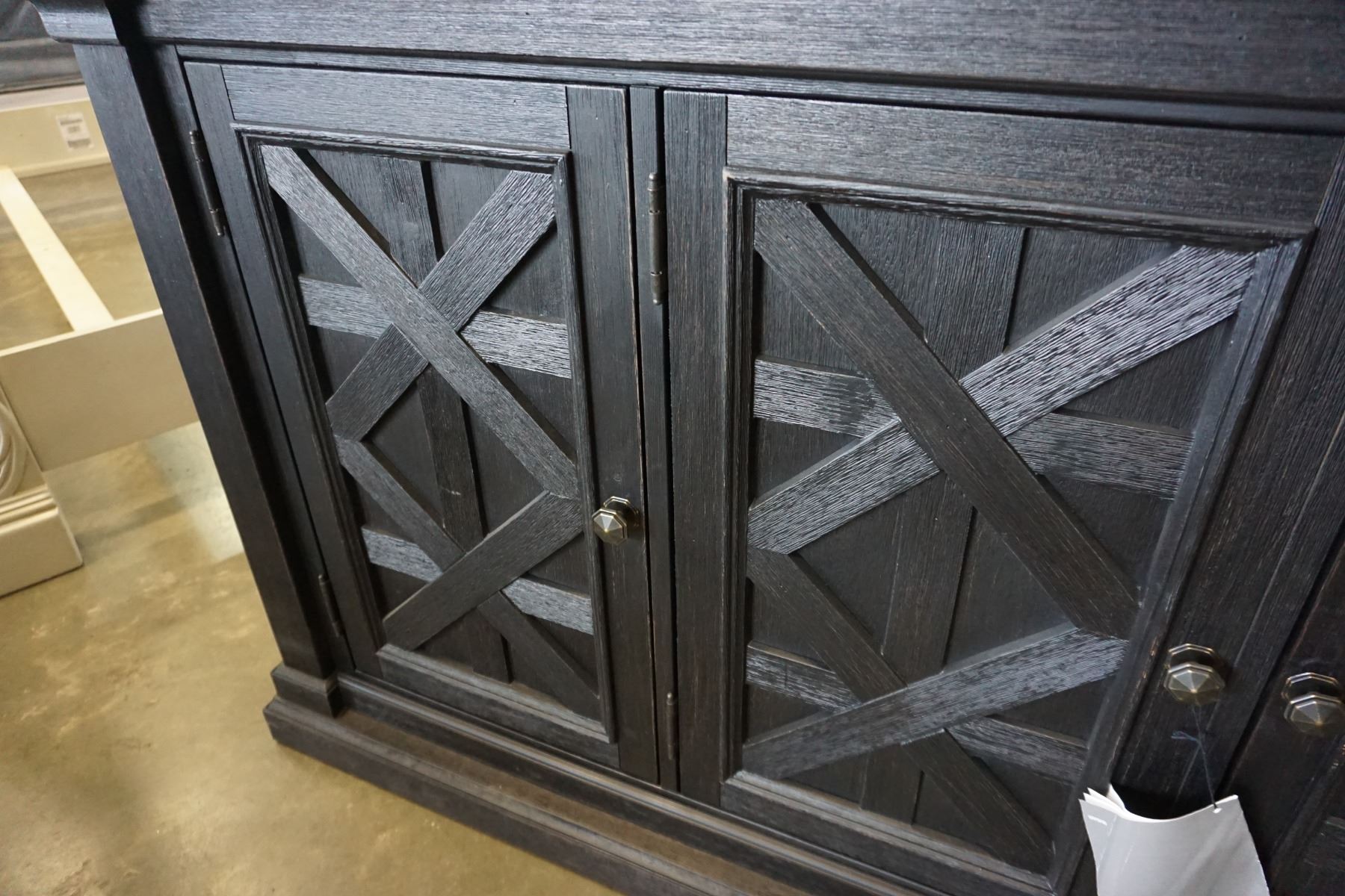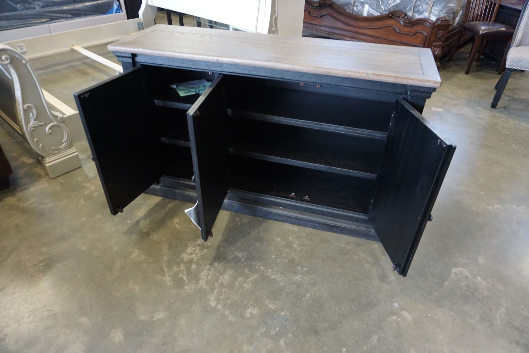 ASHLEY FLOOR MODEL NATURAL WOOD TOP FARMHOUSE SERVING CABINET, WITH 3 DOORS, RETAIL $1899