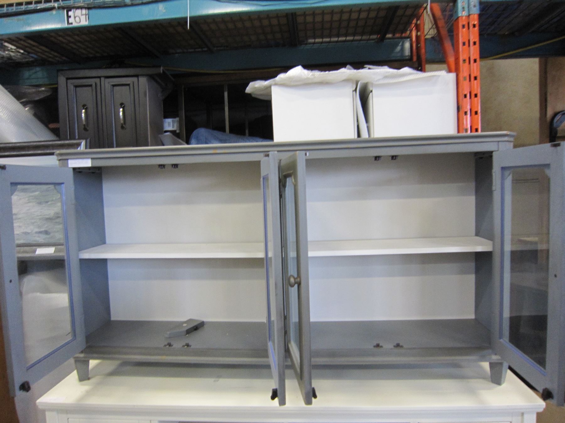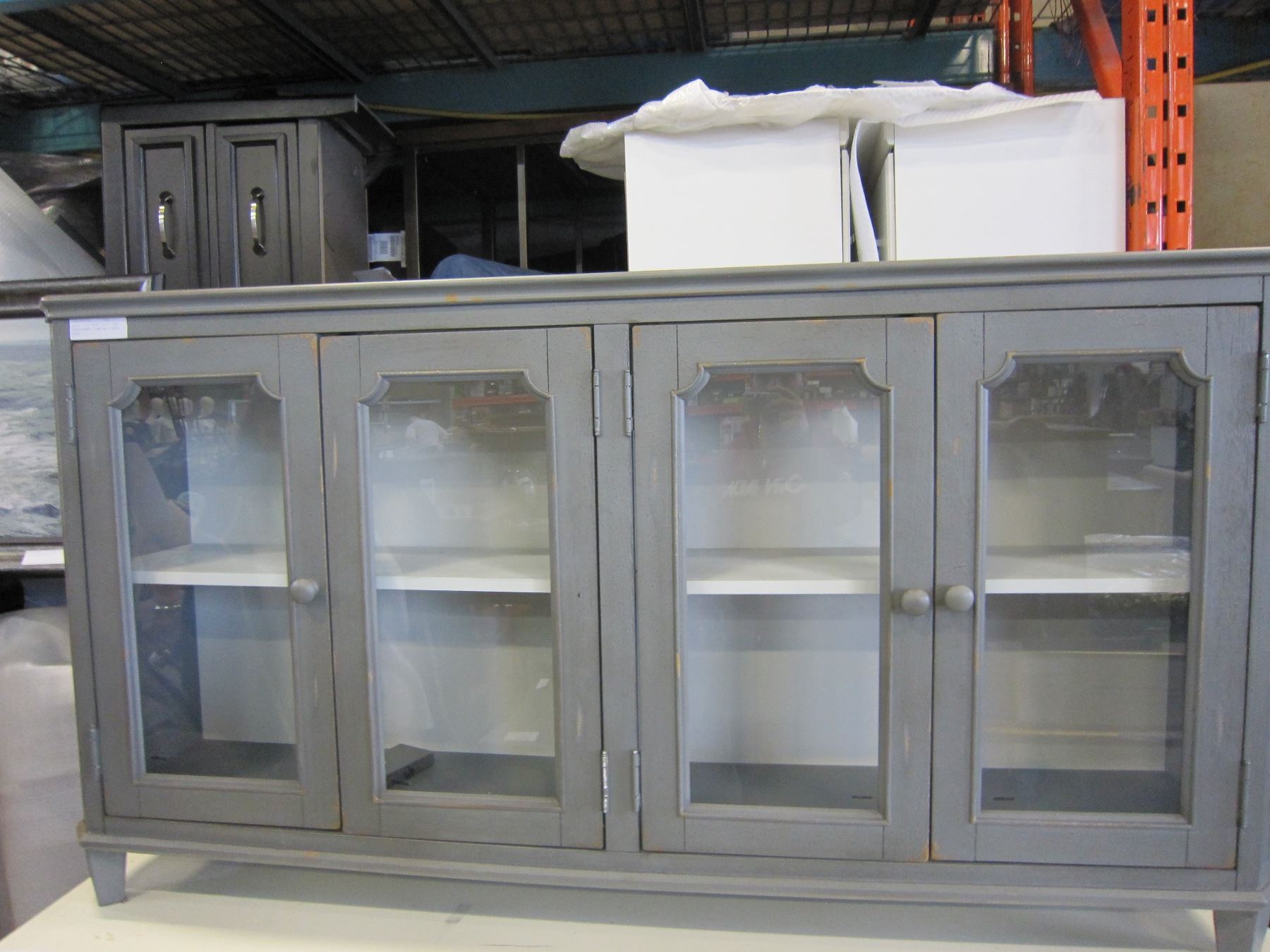 ASHLEY FLOOR MODEL RUSTIC GREY ENTERTAINMENT STAND W/ 4 GLASS DOORS