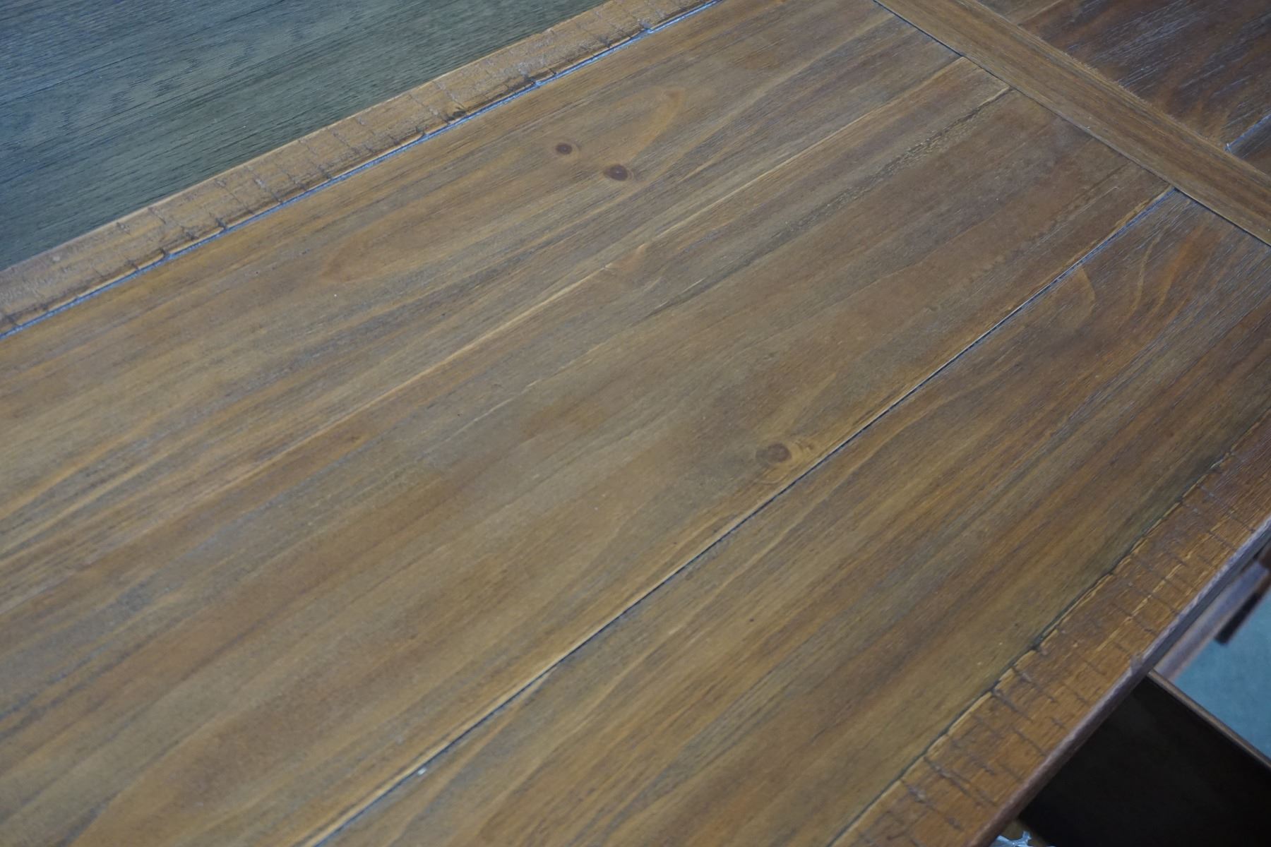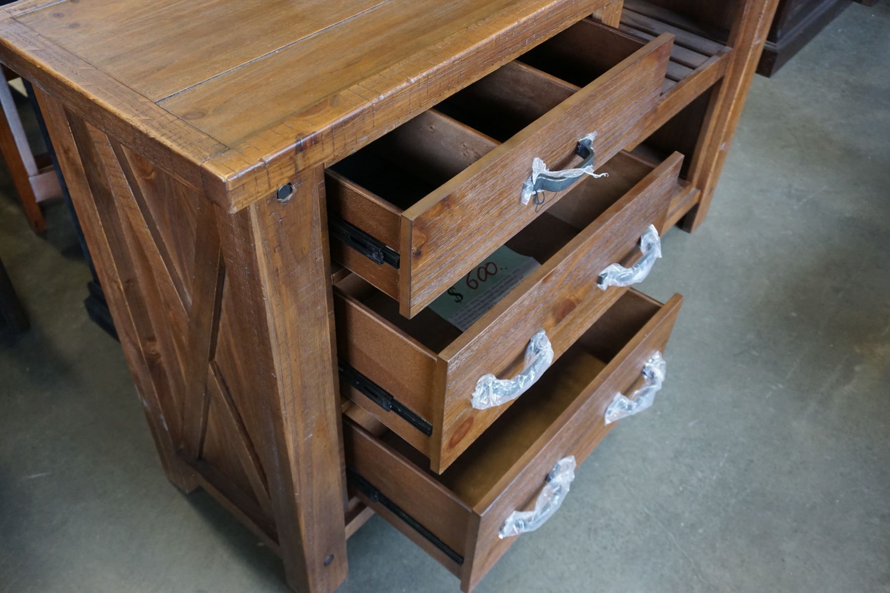 ASHLEY FLOOR MODEL RUSTIC RECLAIMED LOOK 3 DRAWER OPEN SERVING CABINET, RETAIL $1649