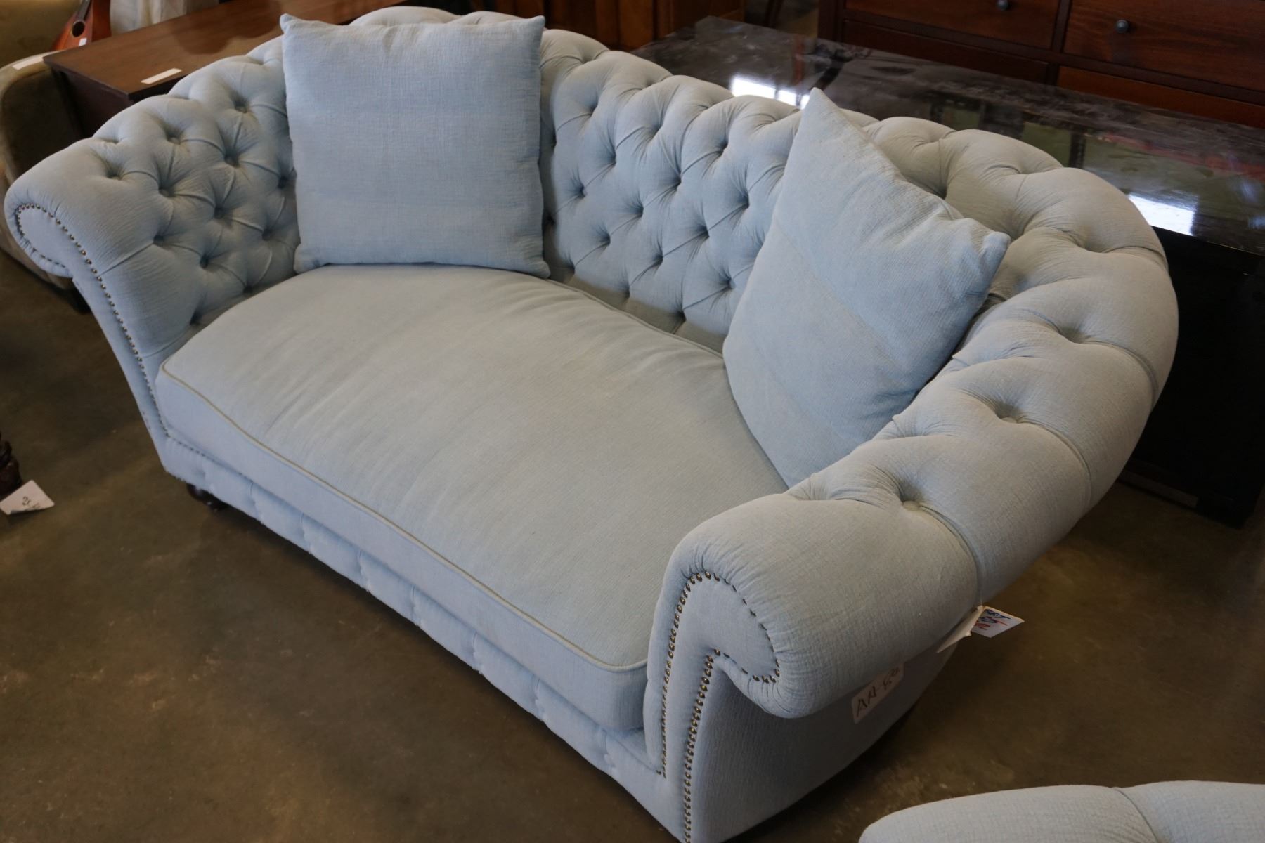 ASHLEY FLOOR MODEL TUFTED FABRIC SOFA AND LOVESEAT WITH 5 PILLOWS, RETAIL $2889