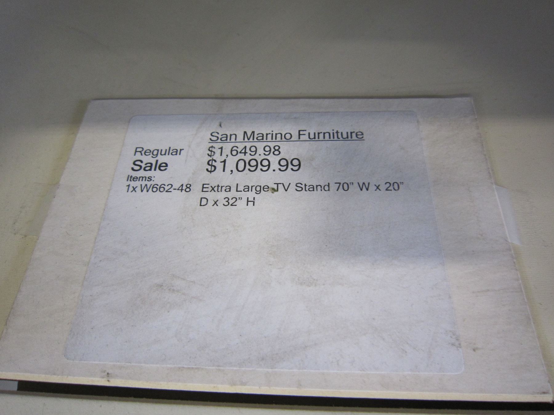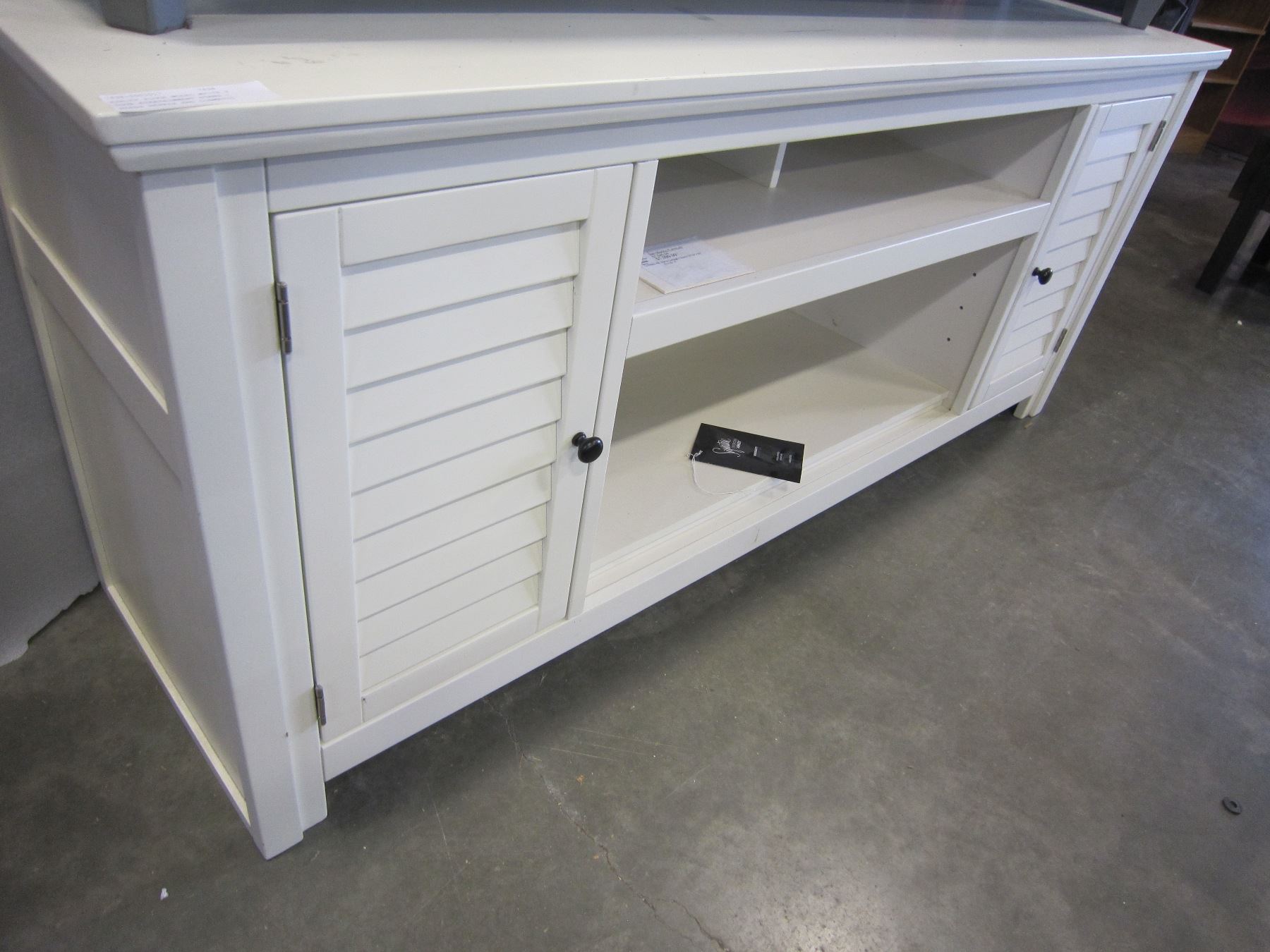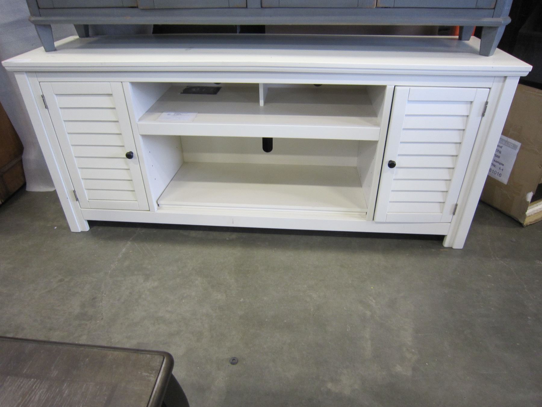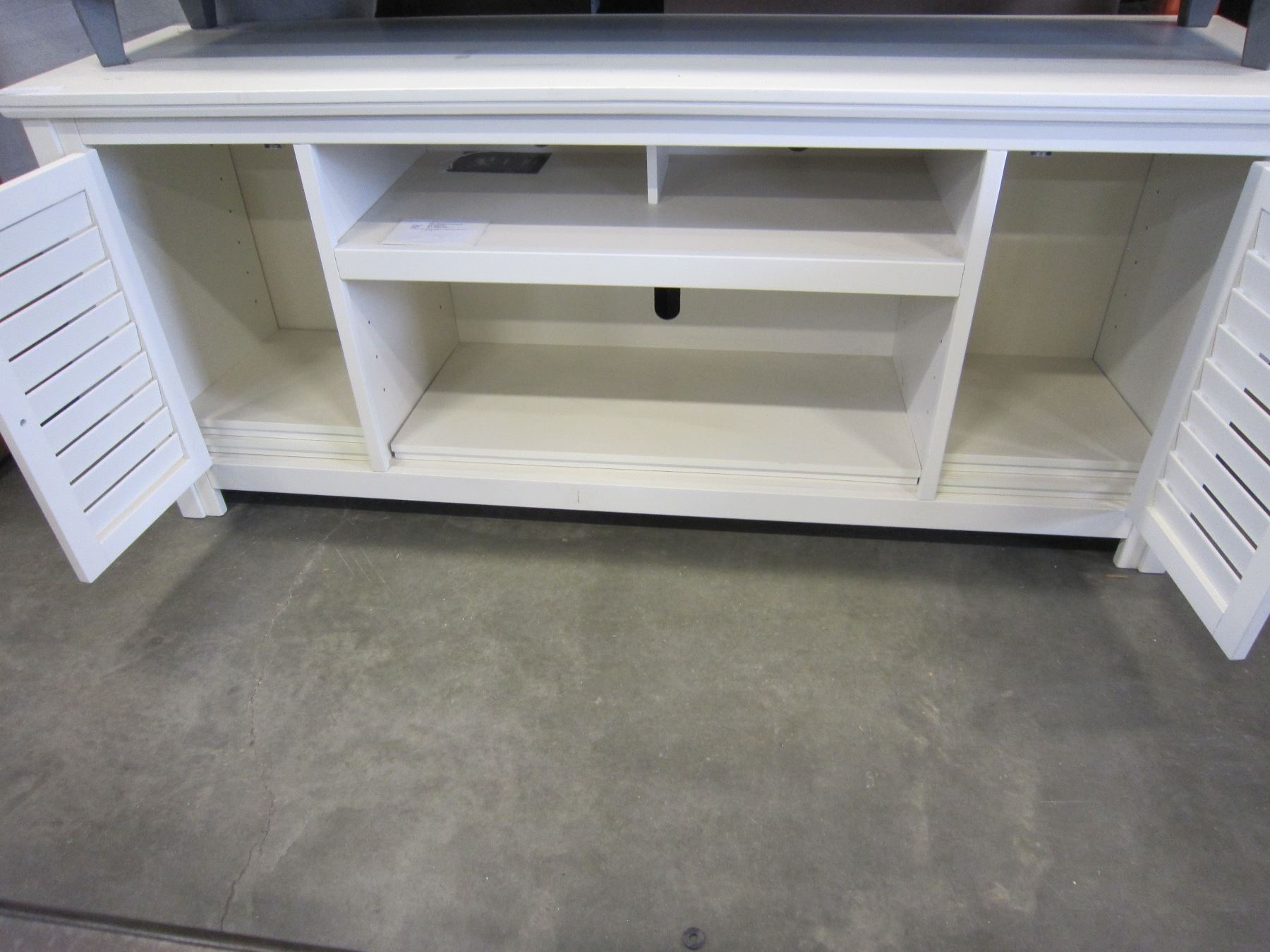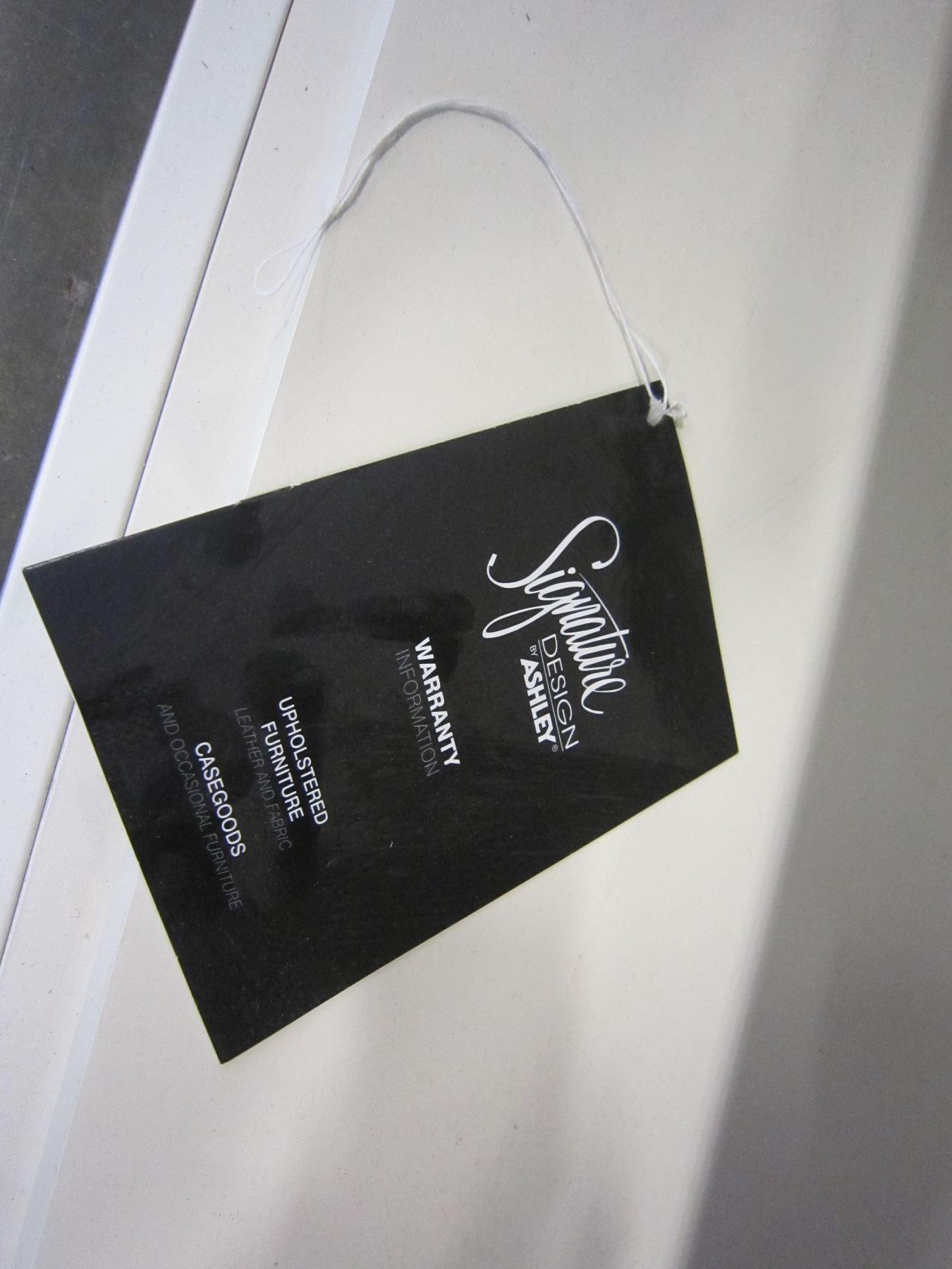 ASHLEY FLOOR MODEL WHITE 2 DOOR ETERTAINMENT STAND - NEEDS REPAIR AND COSMETIC DAMAGE