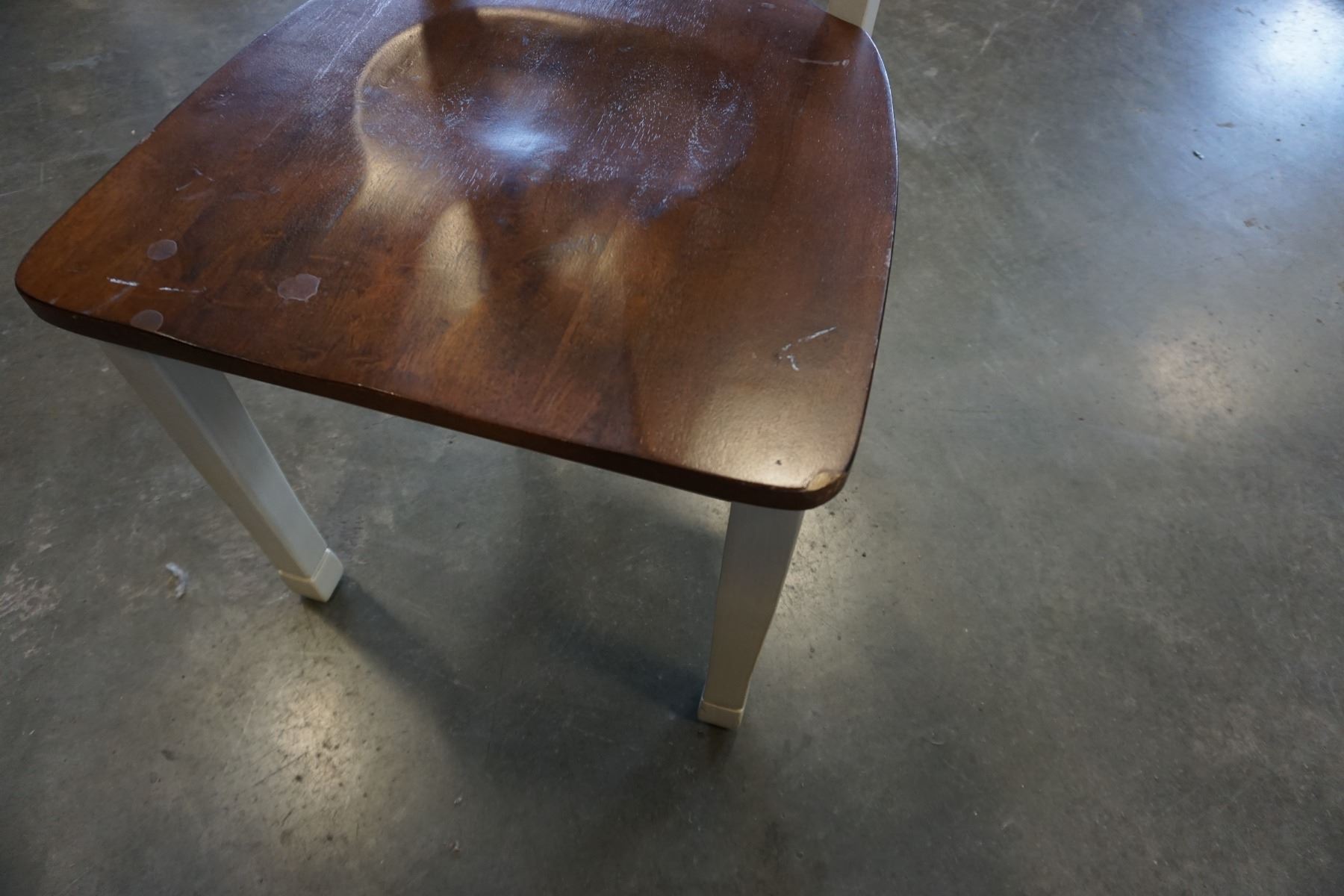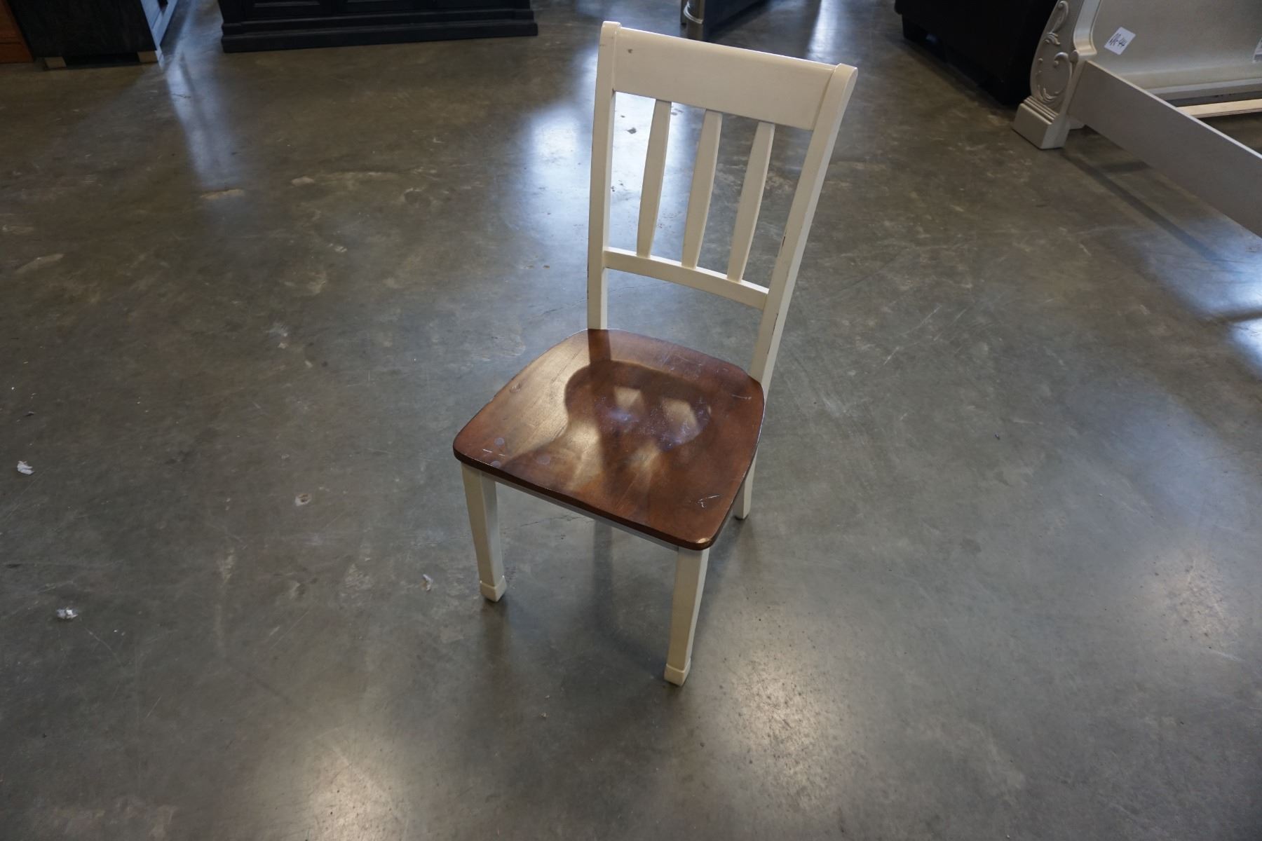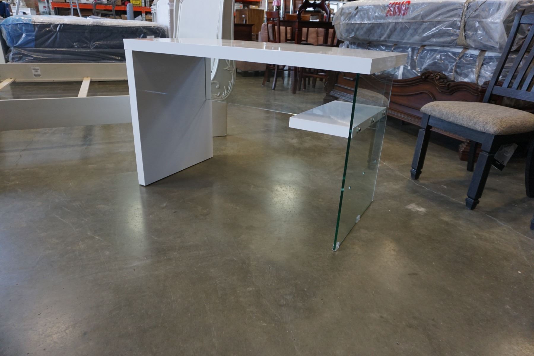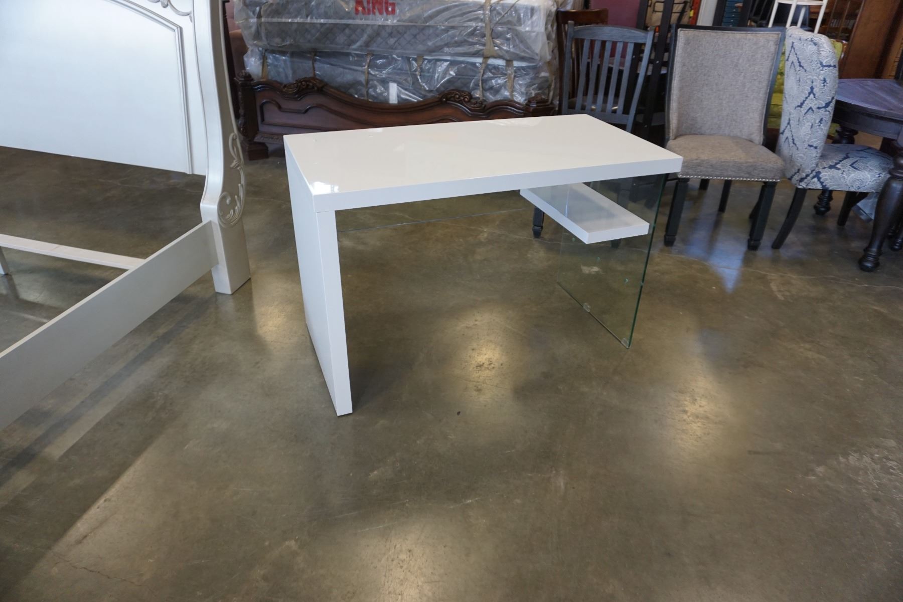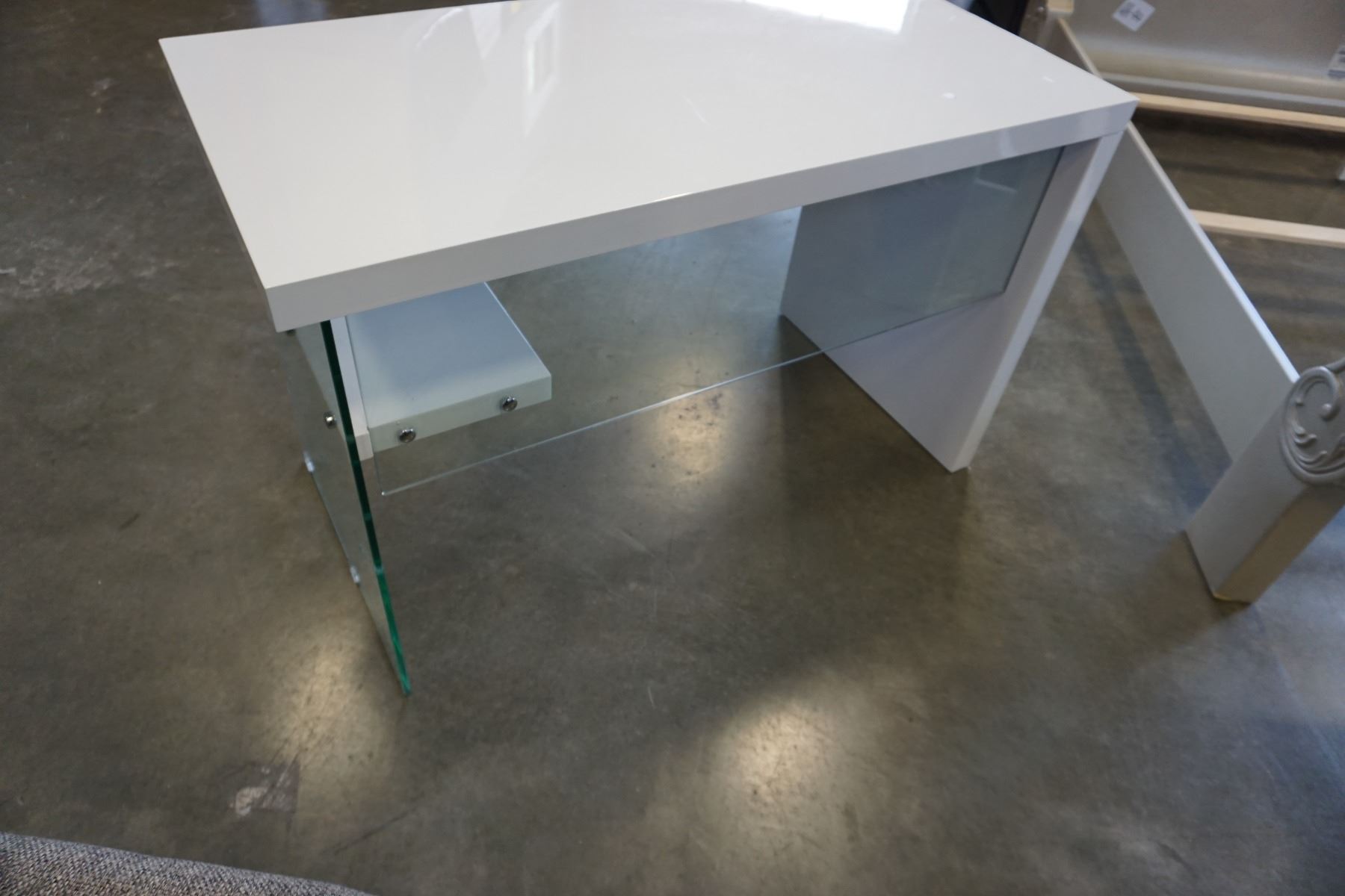 ASHLEY FLOOR MODEL WHITE AND GLASS MODERN DESK, WITH WOODEN CHAIR, RETAIL $699