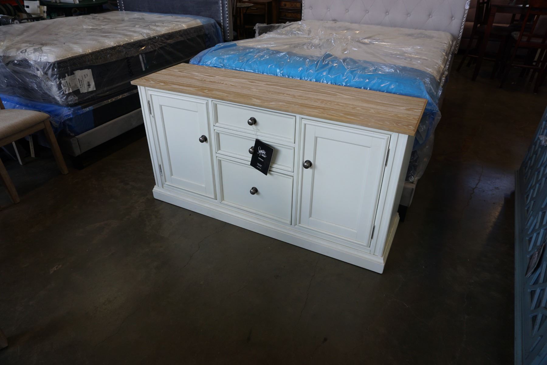 ASHLEY FLOOR MODEL WHITE SERVING CABINET WITH NATURAL WOIOD TOP, AND POWER/USB OUTLETS, RETAIL $1899