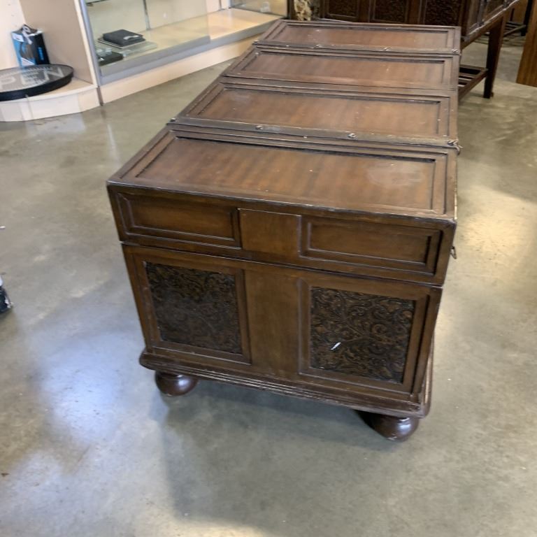 ASHLEY FURNITURE SLIDING TOP STORAGE CABINET WITH RECTANGLE END TABLE WITH DARK BROWN FINISH