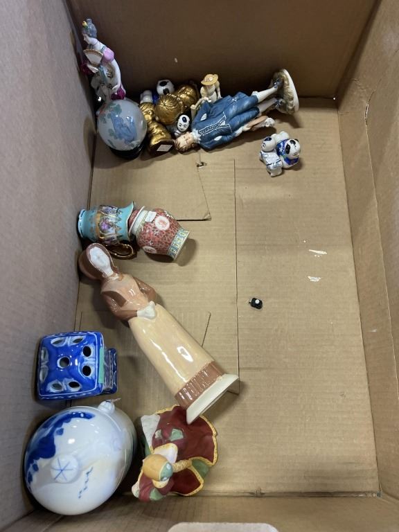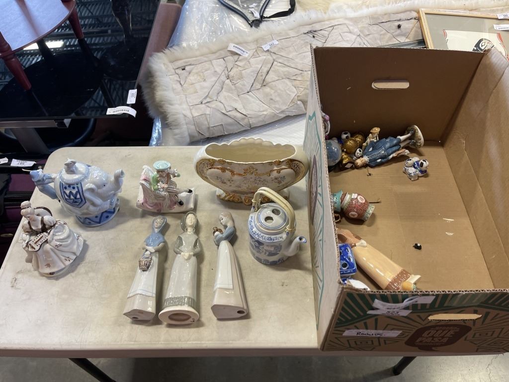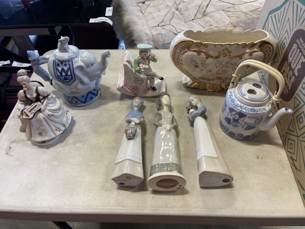 ASSORTED ANTIQUE COLLECTIBLES, SIGNED FIGURINES, TEAPOTS ETC