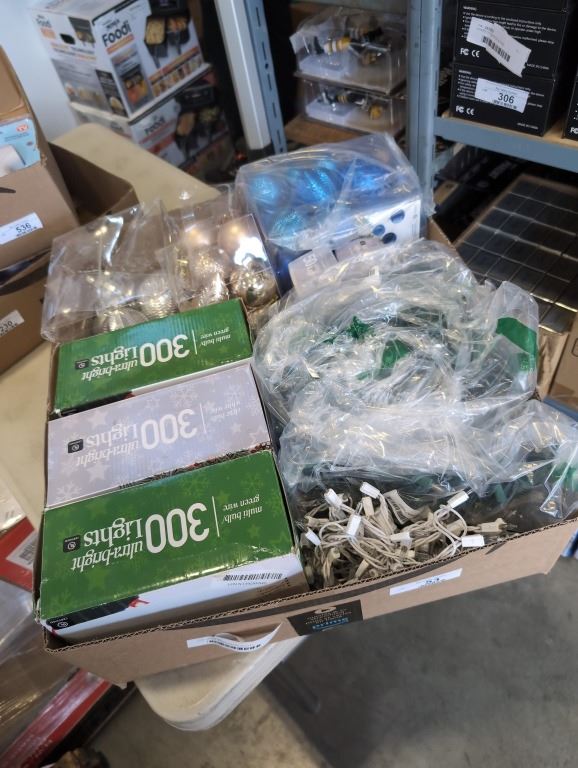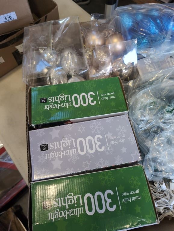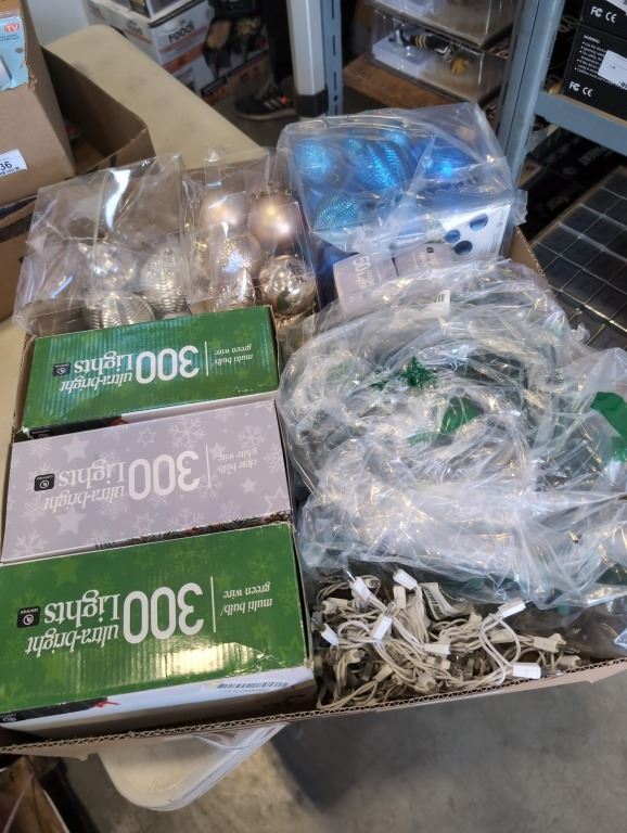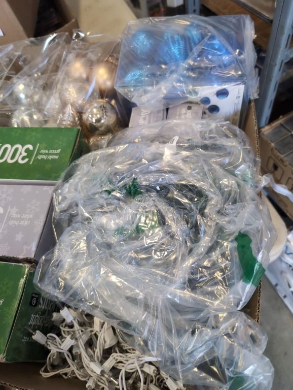 ASSORTED CHRISTMASS DECOR INCLUDING BALLS AND LIGHT SETS