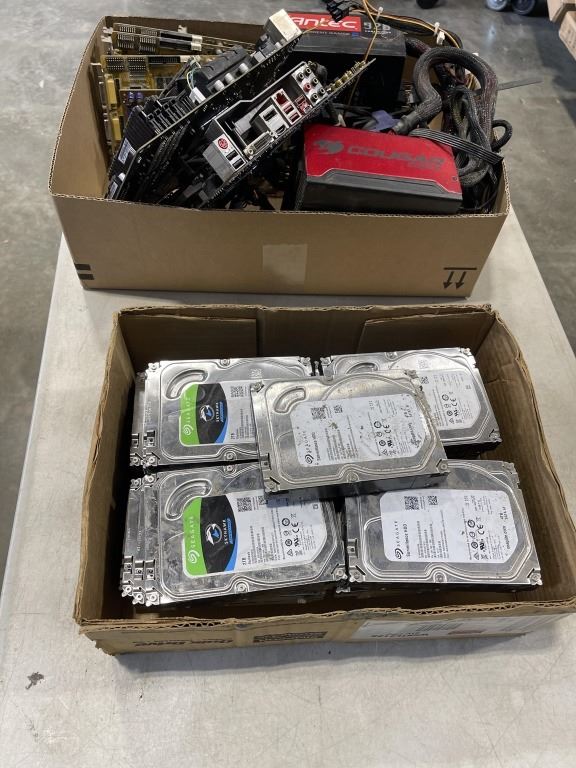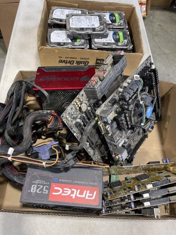 ASSORTED COMPUTER HARD DRIVES, MOTHERBOARDS, FANS