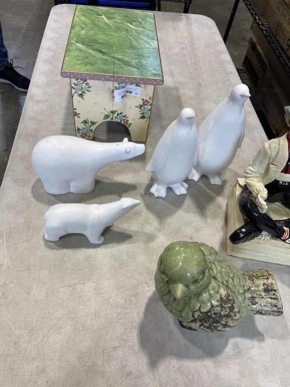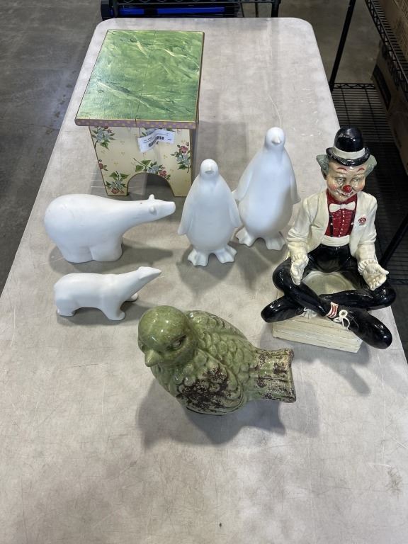 ASSORTED DECORATIVE AND ECOR ITEMS, AND WOODEN STOOL