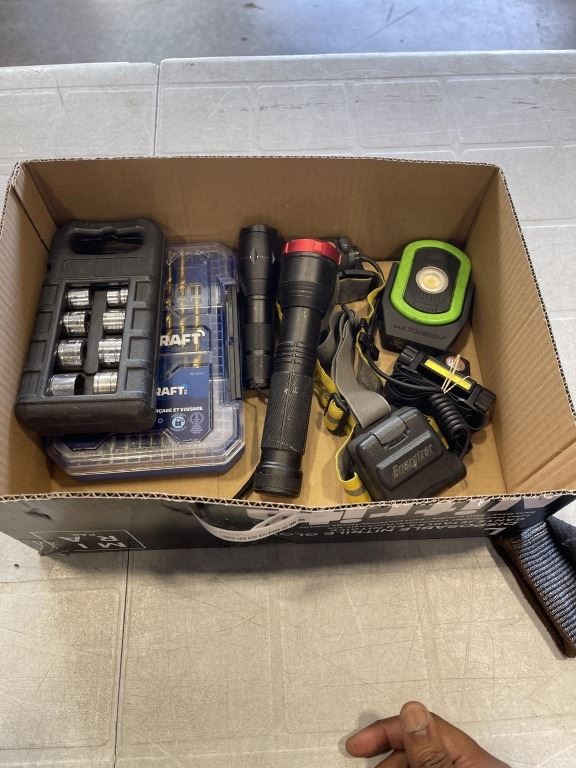 ASSORTED FLAH LIGHTS, HEAD LAMPS, AND BIT / DRILL BIT SETS