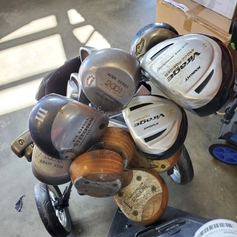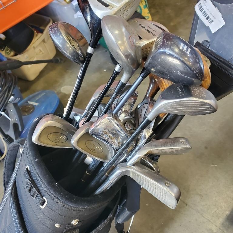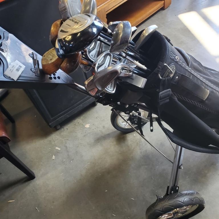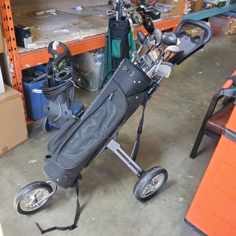 ASSORTED GOLF CLUBS IN BAG AND FOLDING GOLF CART
