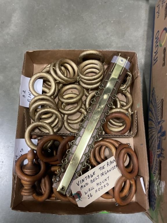 ASSORTED HOUSEHOLD DECOR AND DRAPERY RINGS.