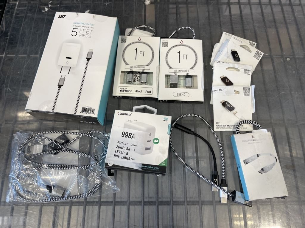 ASSORTED LBT USB-C AND IPHONE LIGHTNING CHARGE AND POWER CORDS, ADAPTERS ETC