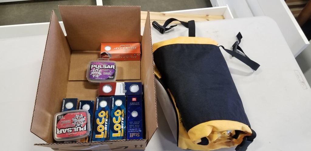 ASSORTED NEW GOLF BALLS, SKI BAG AND SOFT SPIKES FOR GOLF SHOES