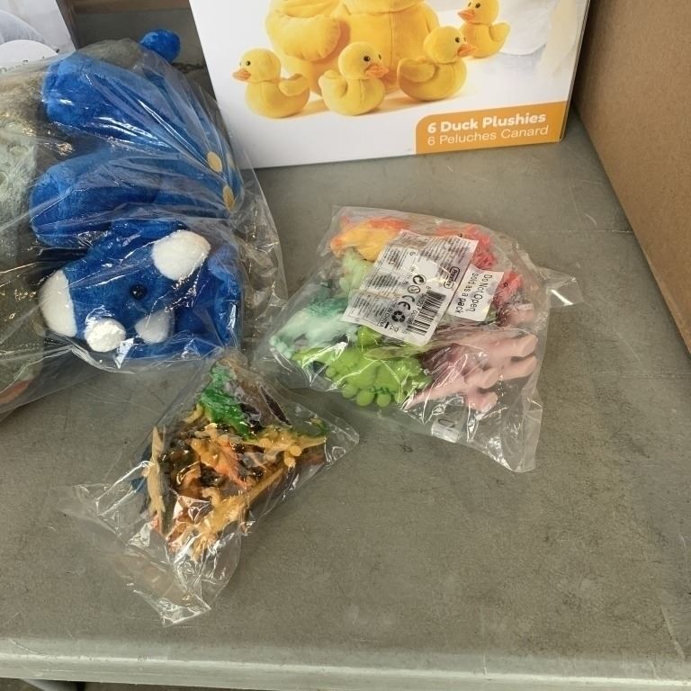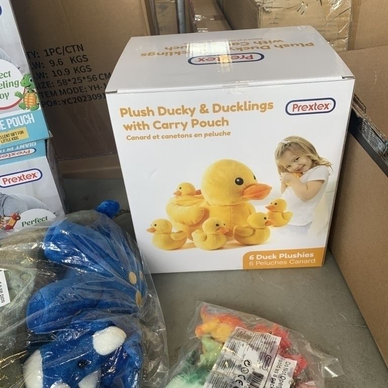 ASSORTED NEW PREXTEX KIDS PLUSH AND DINO TOYS, INCLUDING GIANT PLUSH TURTLE WITH 3 SMALL TURTLES, PLUSH DUCK AND DUCKLINGS, 2 PACKS OF DINO'S, AND PLUSH DINOS