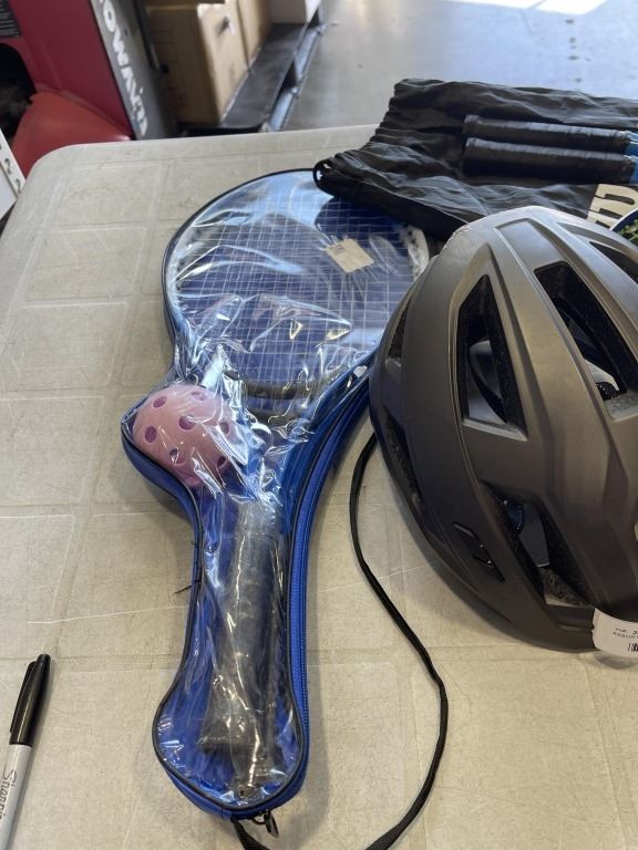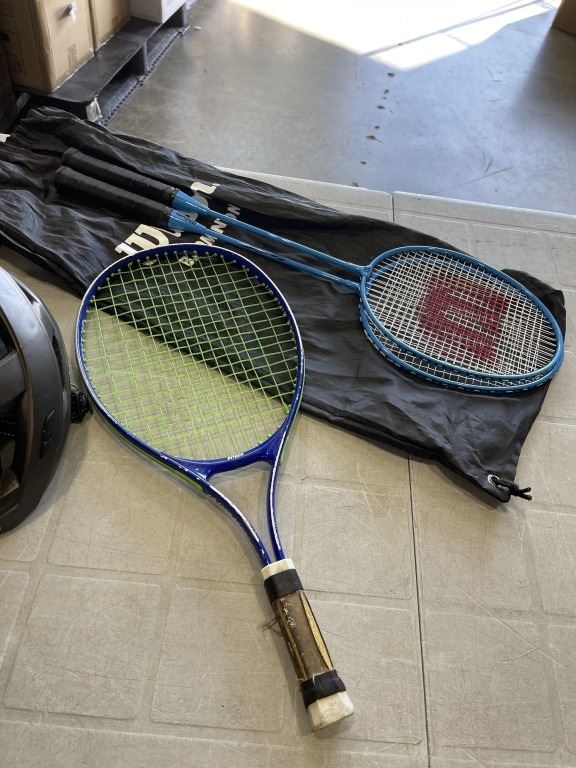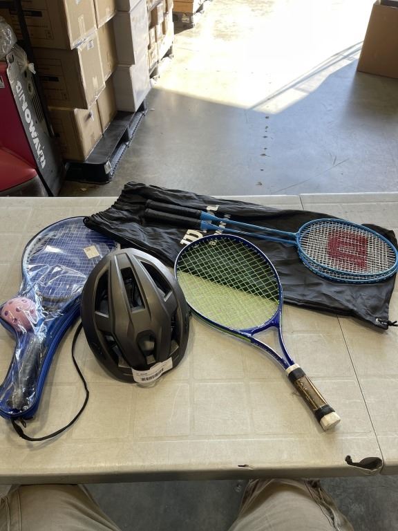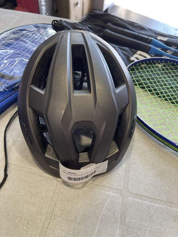 ASSORTED RACQUETS AND BIKE HELMET WITH MIPS AND LED LIGHTS