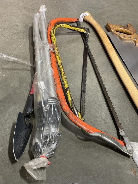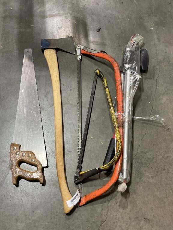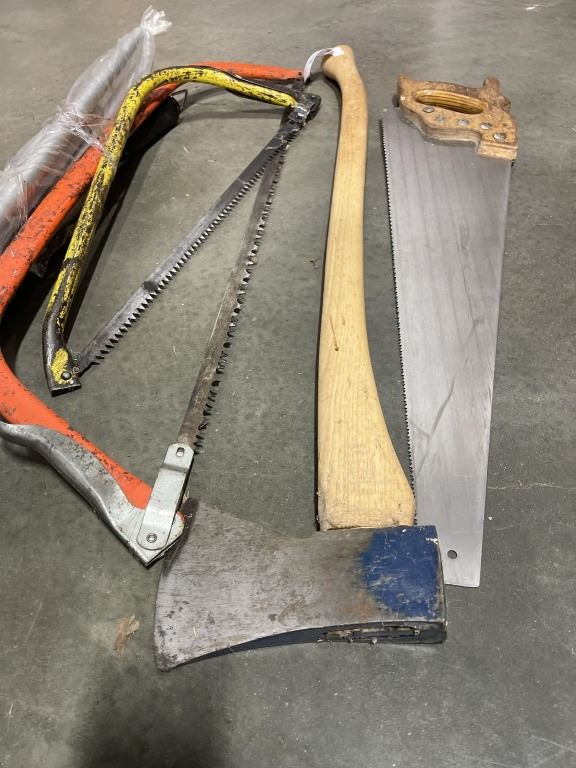 ASSORTED SAWS, AXE, TRIPOD ETC