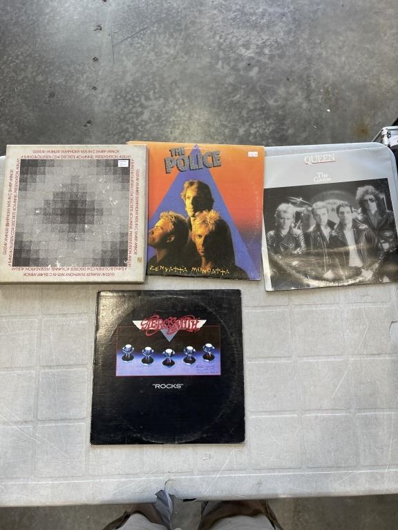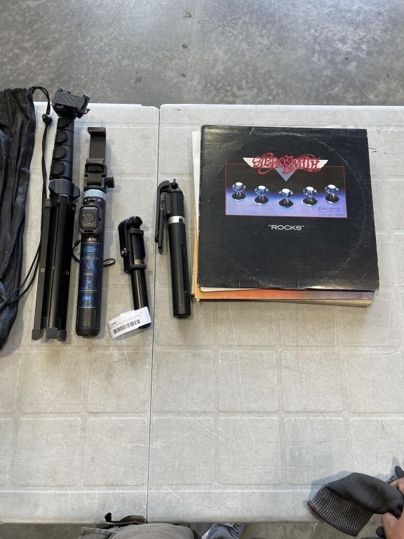 ASSORTED SELFIE STICKS AND TRIPODS, AND RECORDS