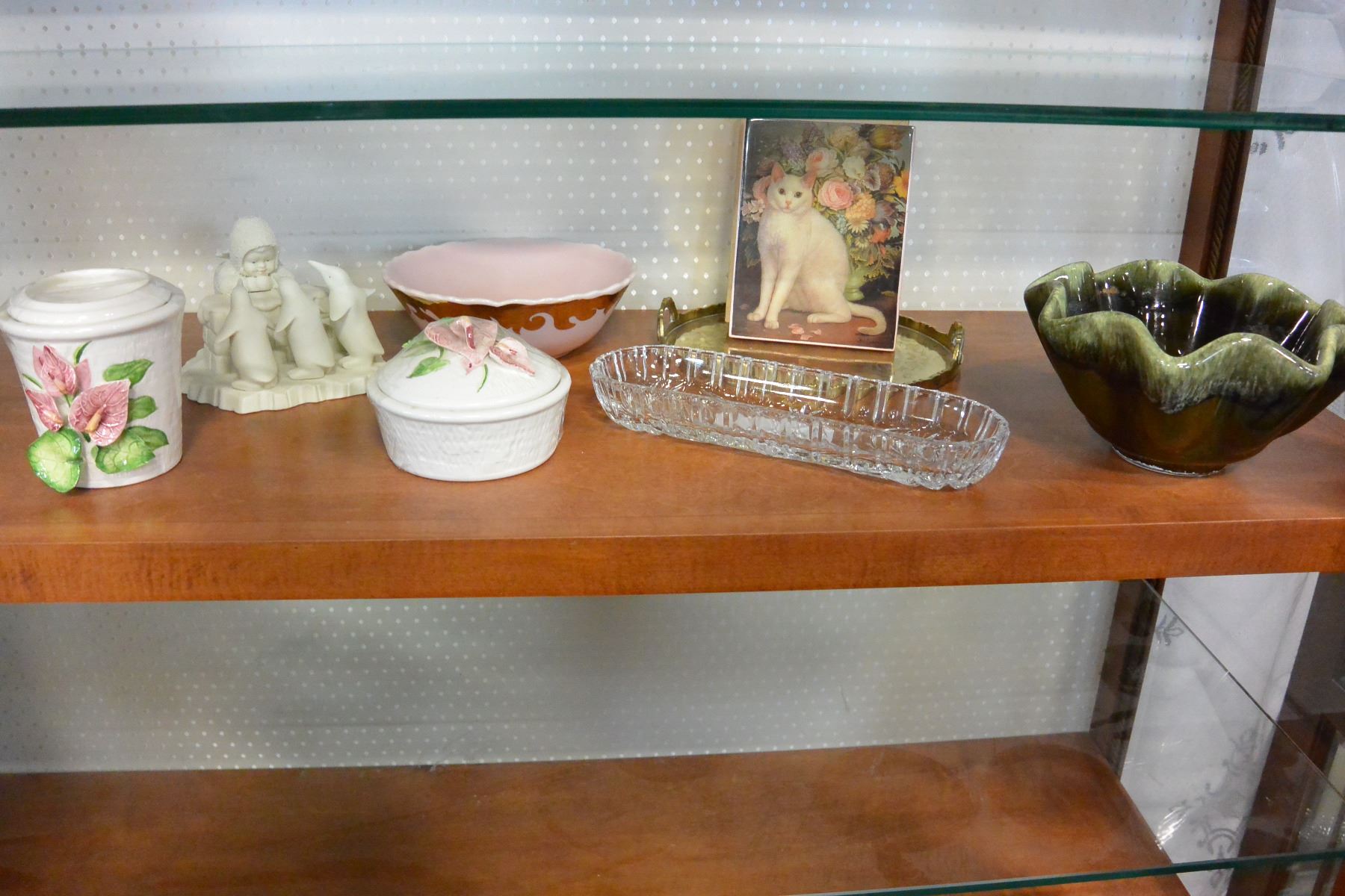ASSORTED VINTAGE COLLECTIBLES, BRASS TRAY, HULL POTTERY PLANTER, CRYSTAL DISH, ETC.