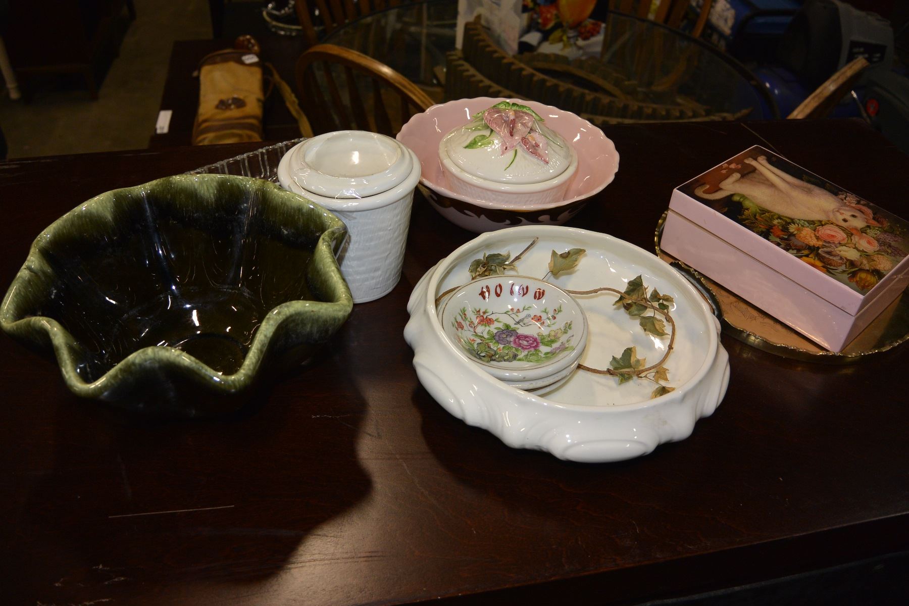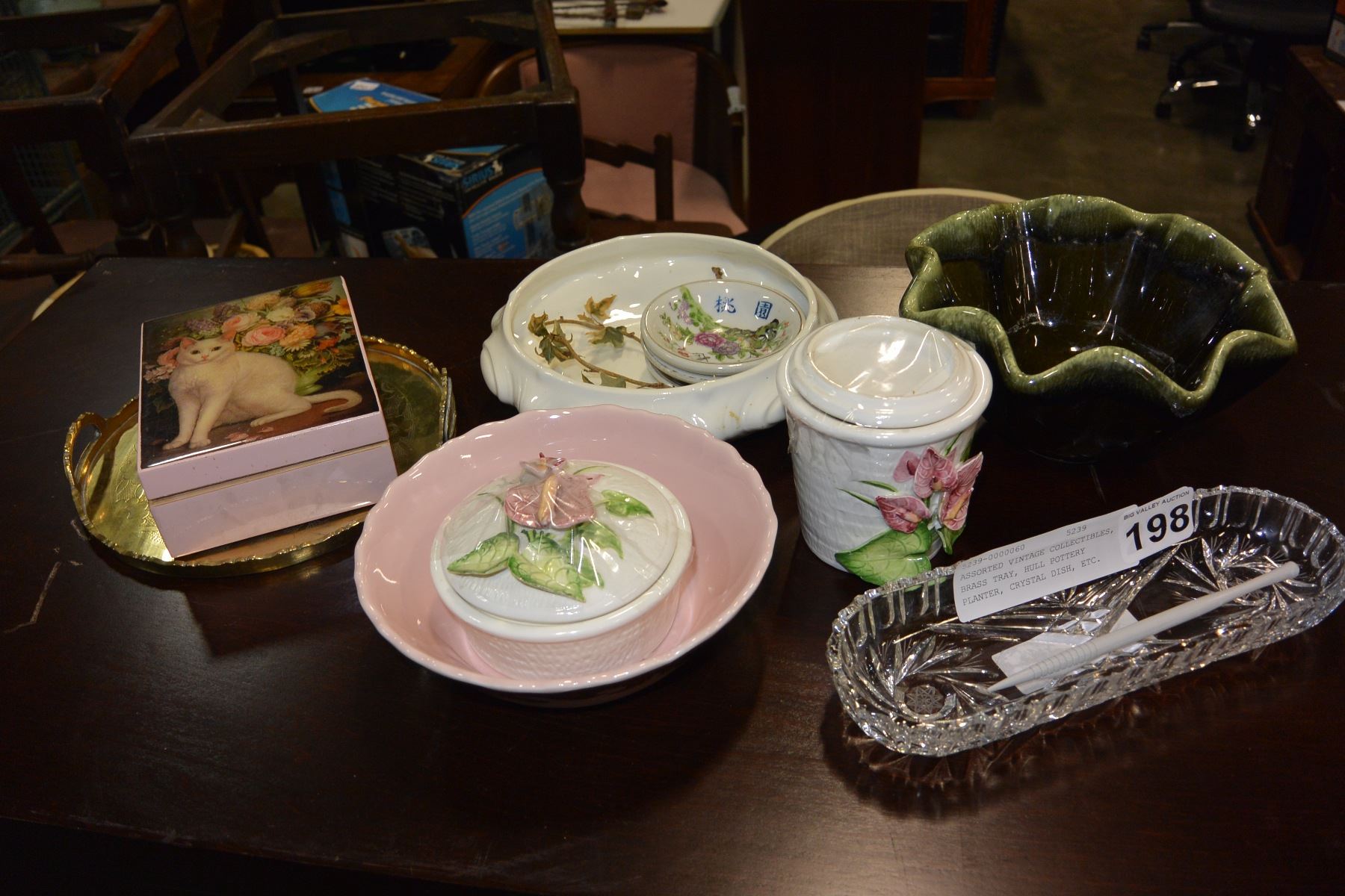 ASSORTED VINTAGE COLLECTIBLES, BRASS TRAY, HULL POTTERY PLANTER, CRYSTAL DISH, ETC.