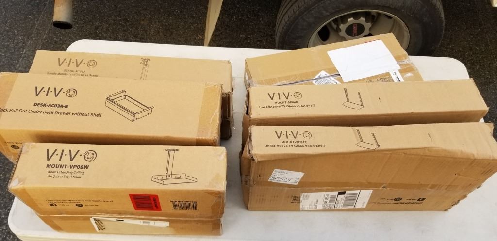 ASSORTED VIVO MONITO MOUNTS, SHELVES AND DRAWER KIT