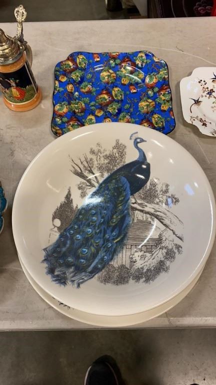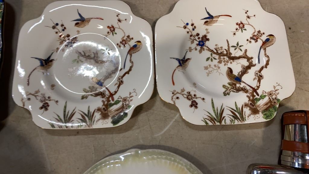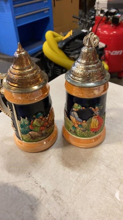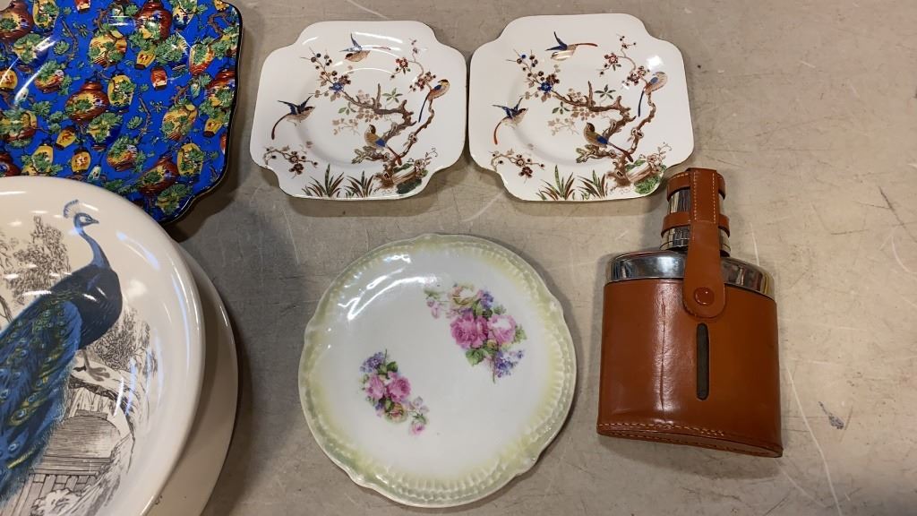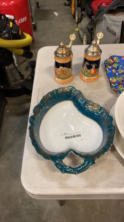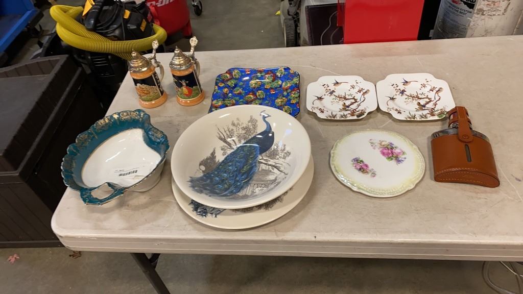 AUSTRIAN AND ENGLISH CHINA WITH SMALL STEINS AND LEATHER WRAPPED FLASK