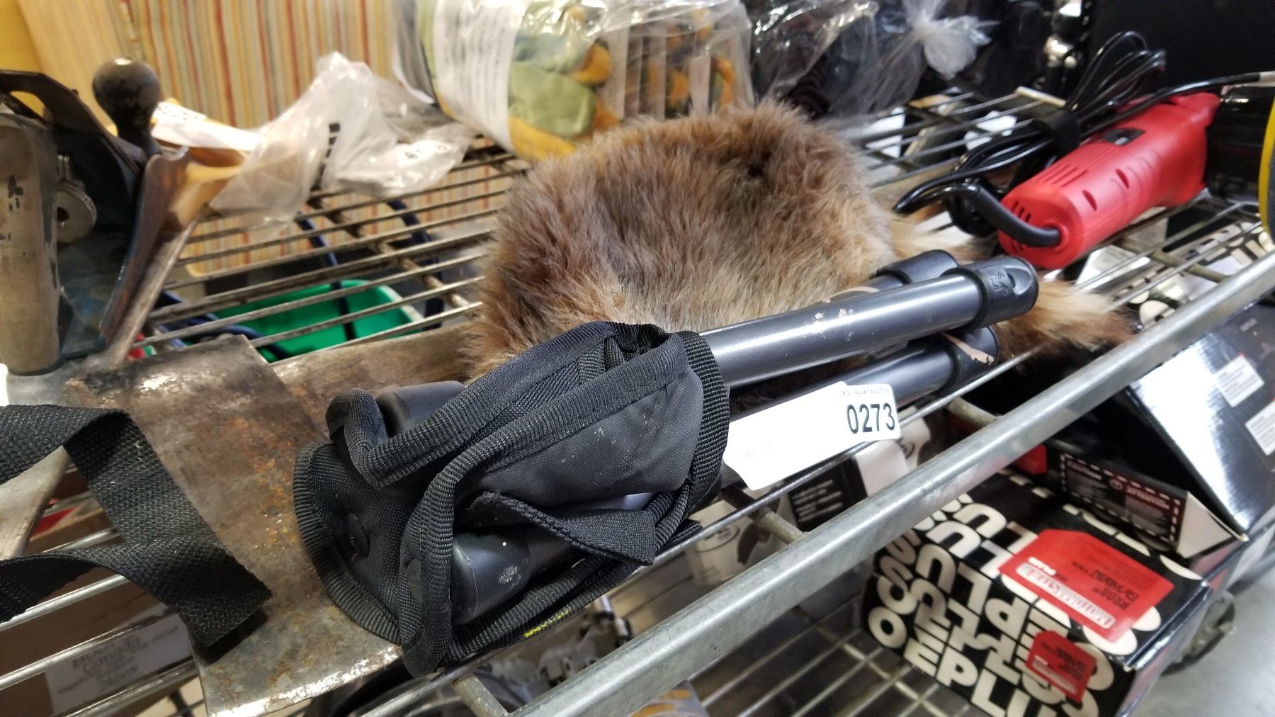 AXE, FOLDING STOOL AND DAVEY CROCKET HAT