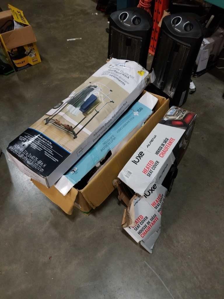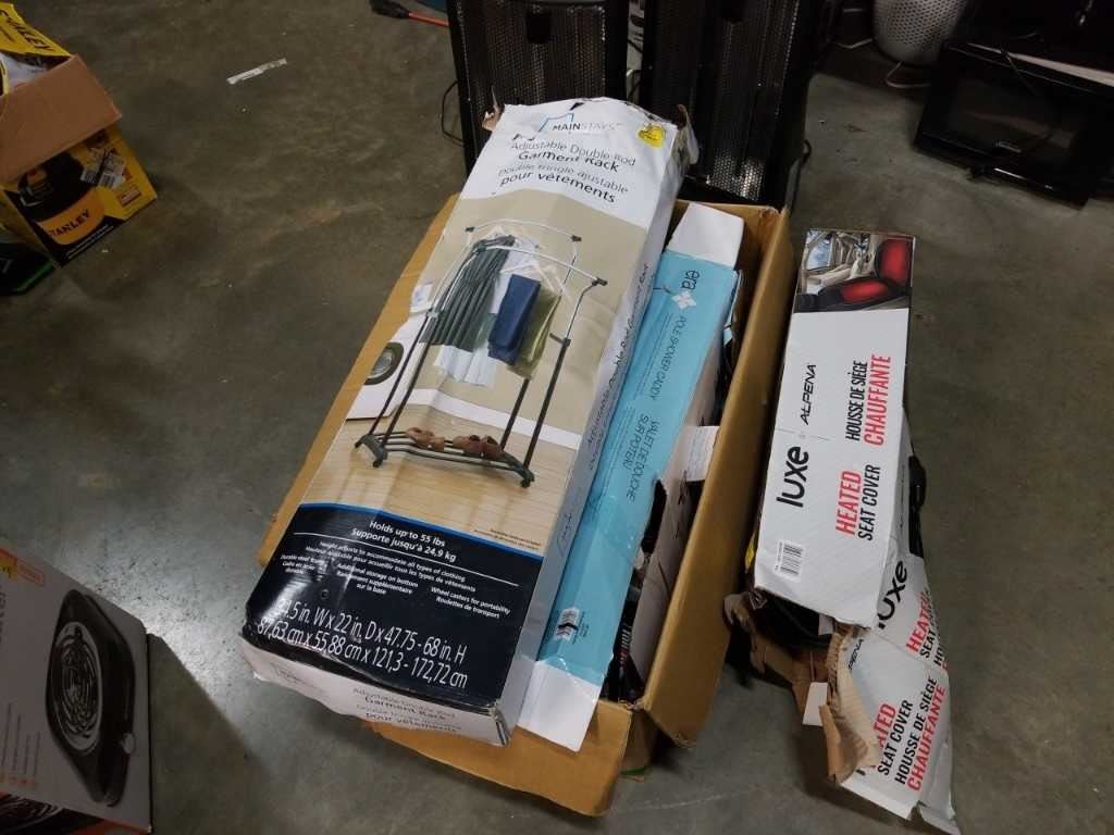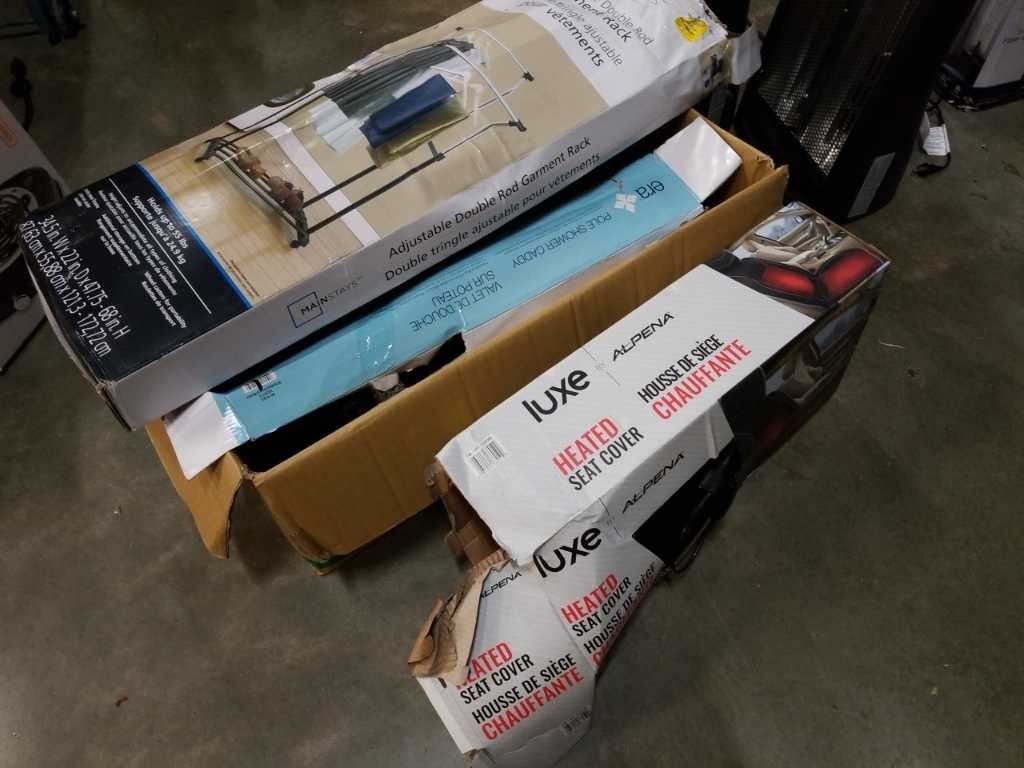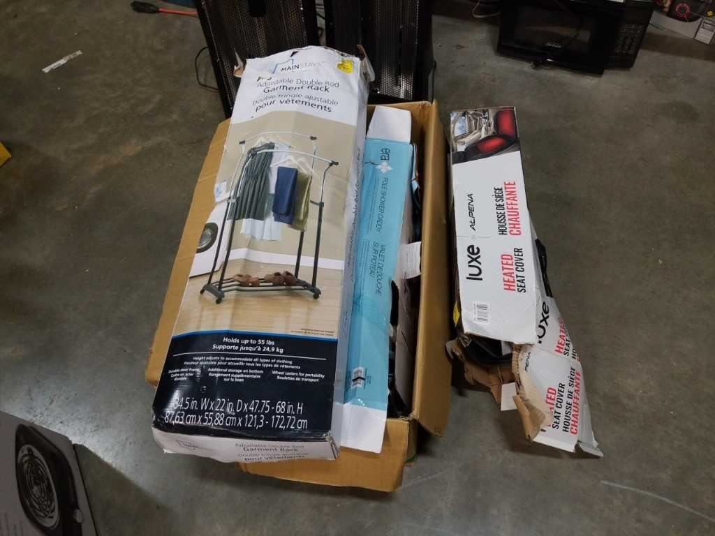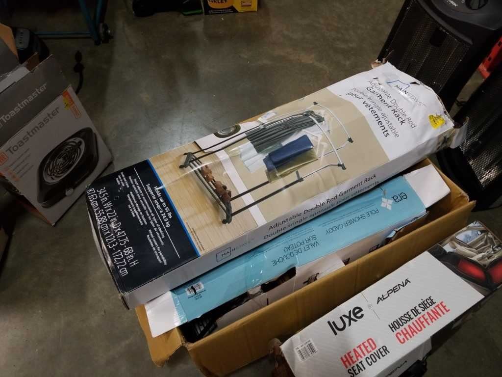 Adjustable double rod garment rack, pole shower caddy and Lux heated seat cover - store returns
