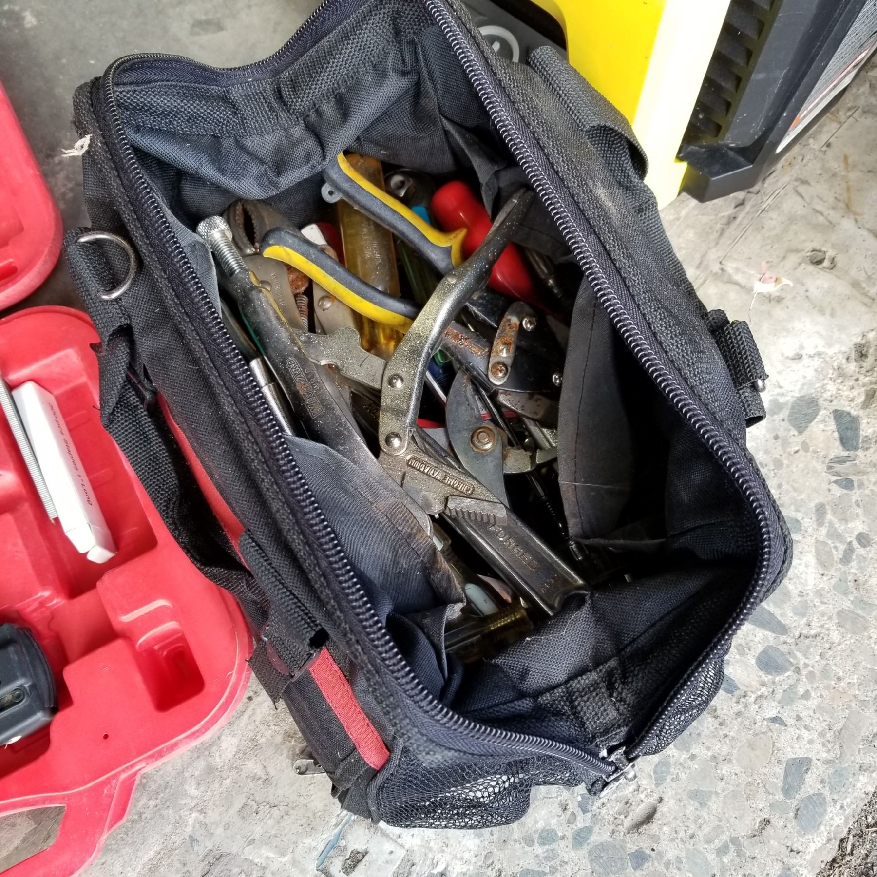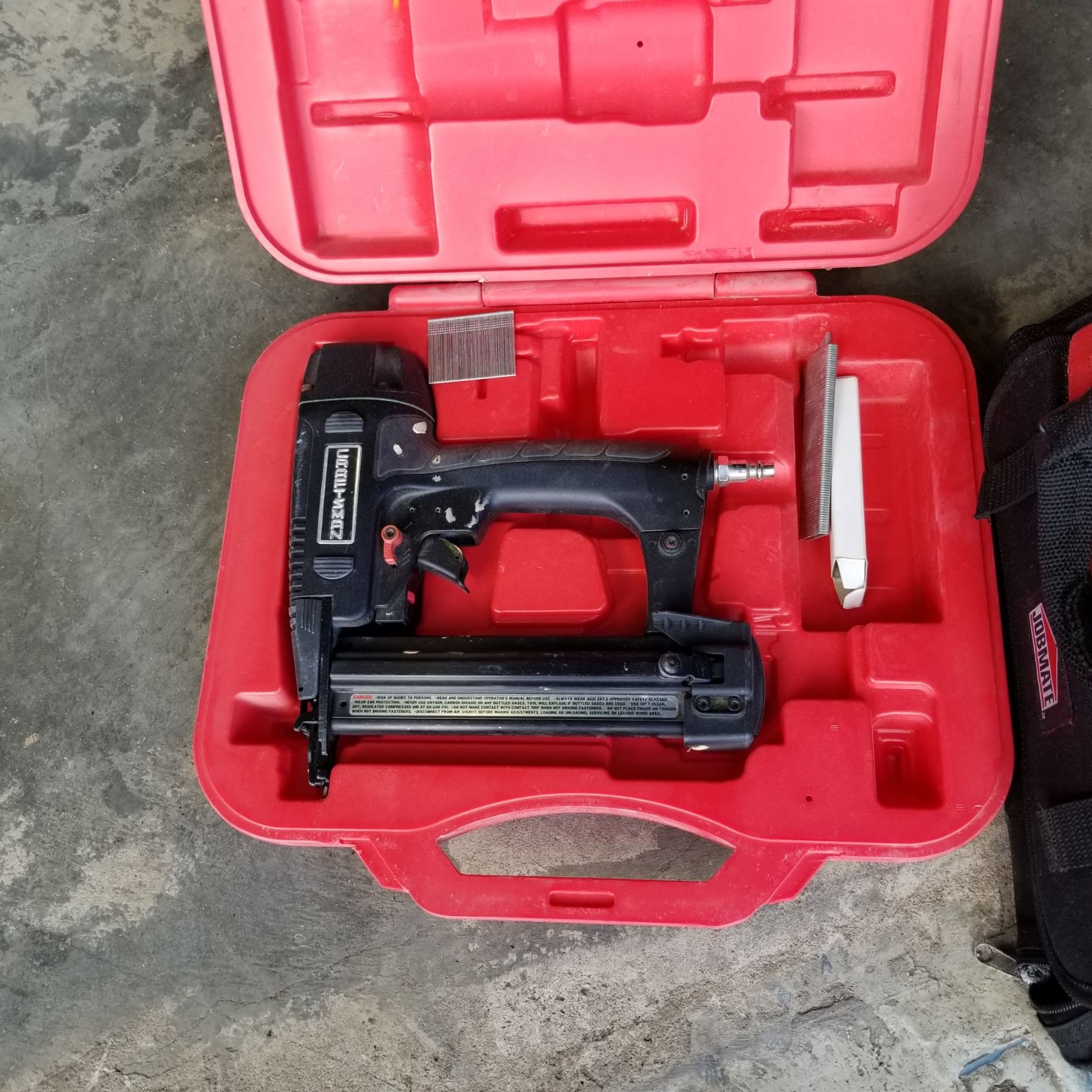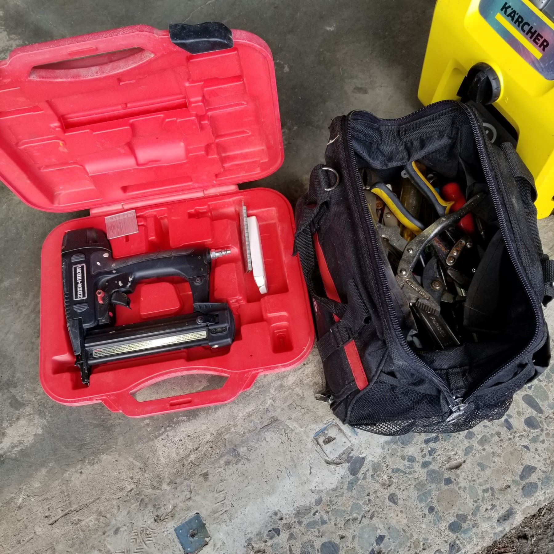 BAG OF HAND TOOLS AND CRAFTSMAN NAILER IN RED CASE
