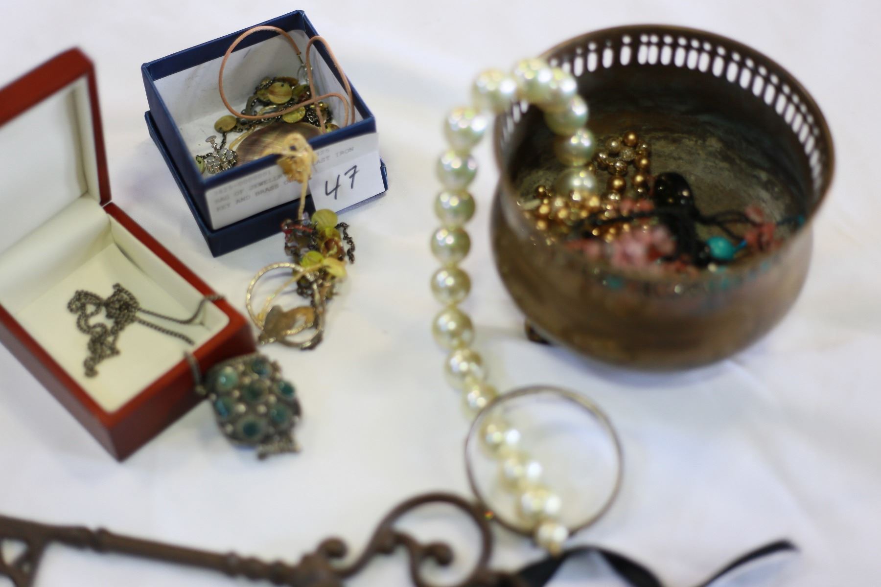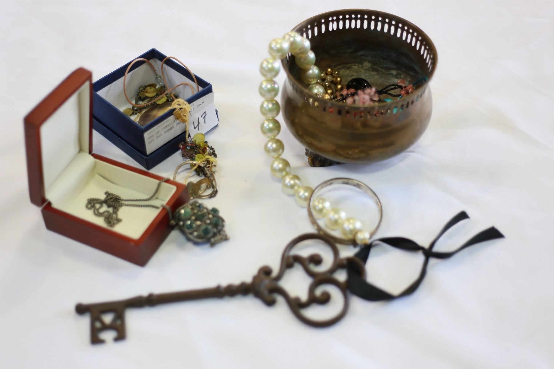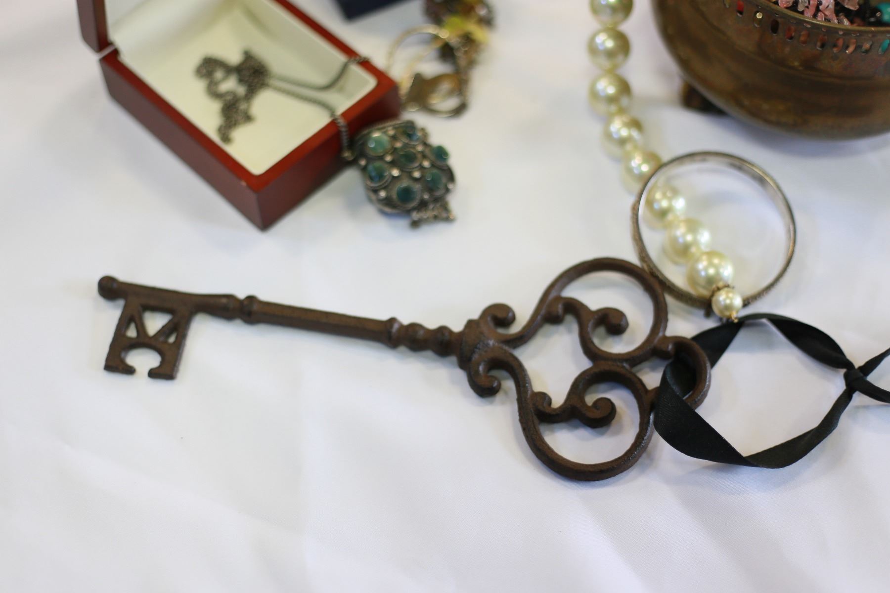 BAG OF JEWELLRY AND CAST IRON KEY AND BRASS OWL