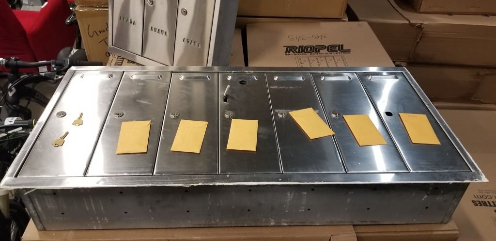 BANK OF 7 STAINLESS MAILBOXES WITH INDIVIDUAL KEYS