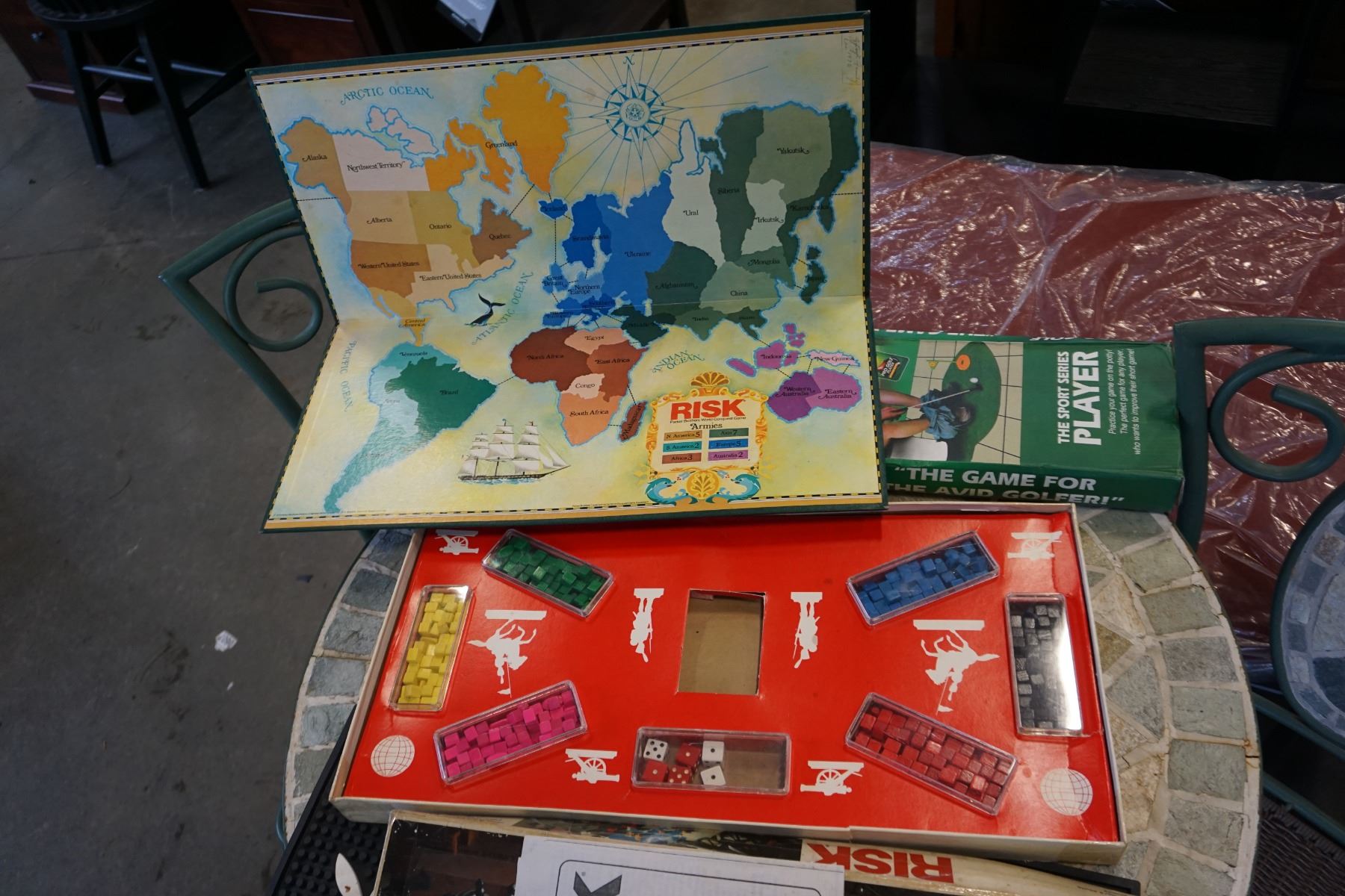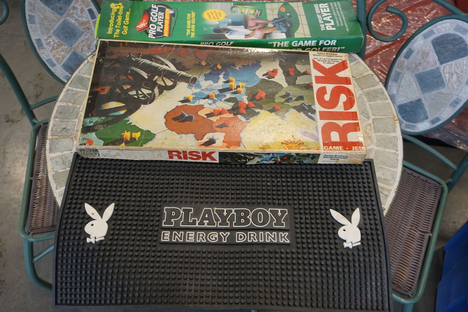 BAR MAT, VINTAGE RISK GAME WITH WOOD PIECES AND BATHROOM GOLF GAME