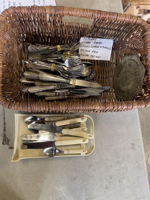 BASKET OF ASSORTED ANTIQUE CUTLERY, INCLDUING SOME SILVER