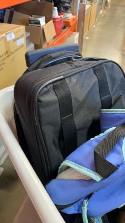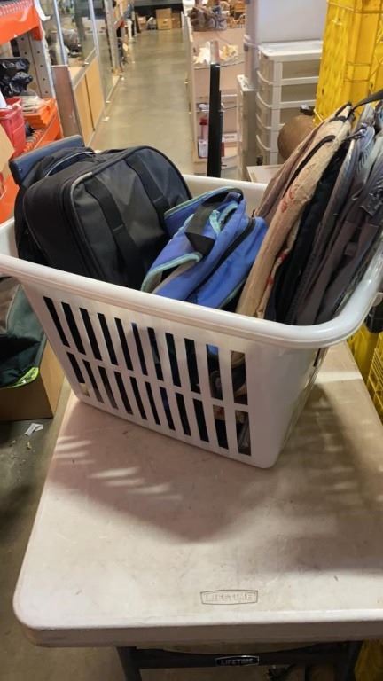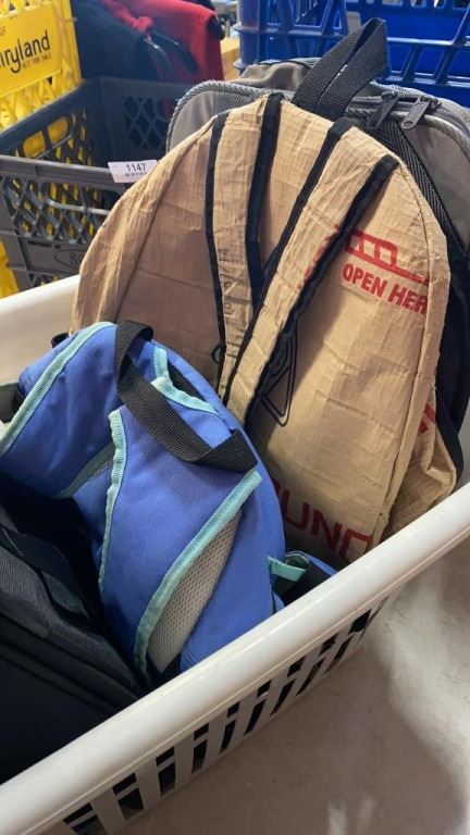 BASKET OF BACKPACKS AND BAGS