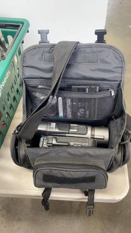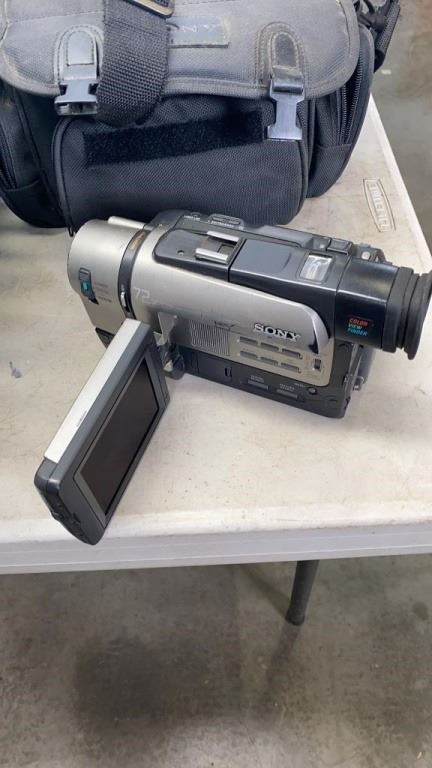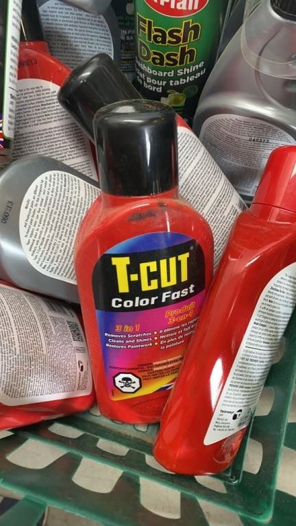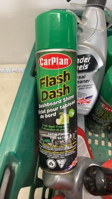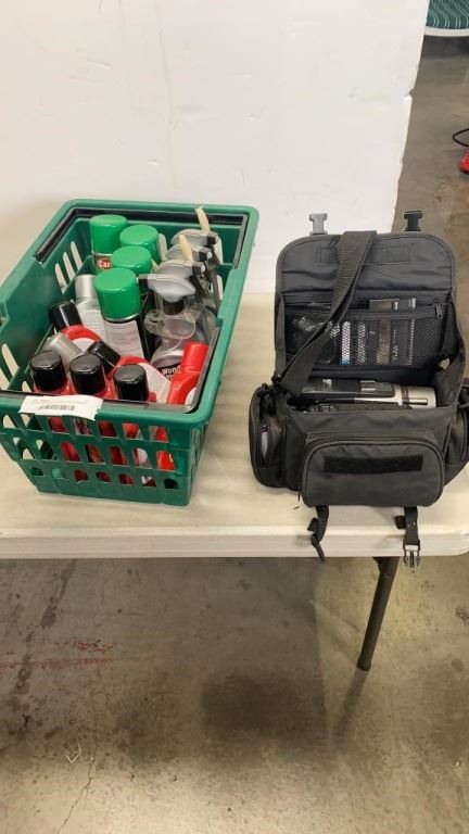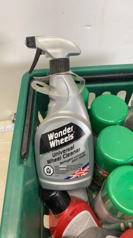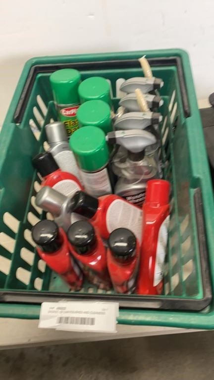 BASKET OF CAR POLISHES AND CLEANERS WITH SONY VHSC VIDEO CAMERA