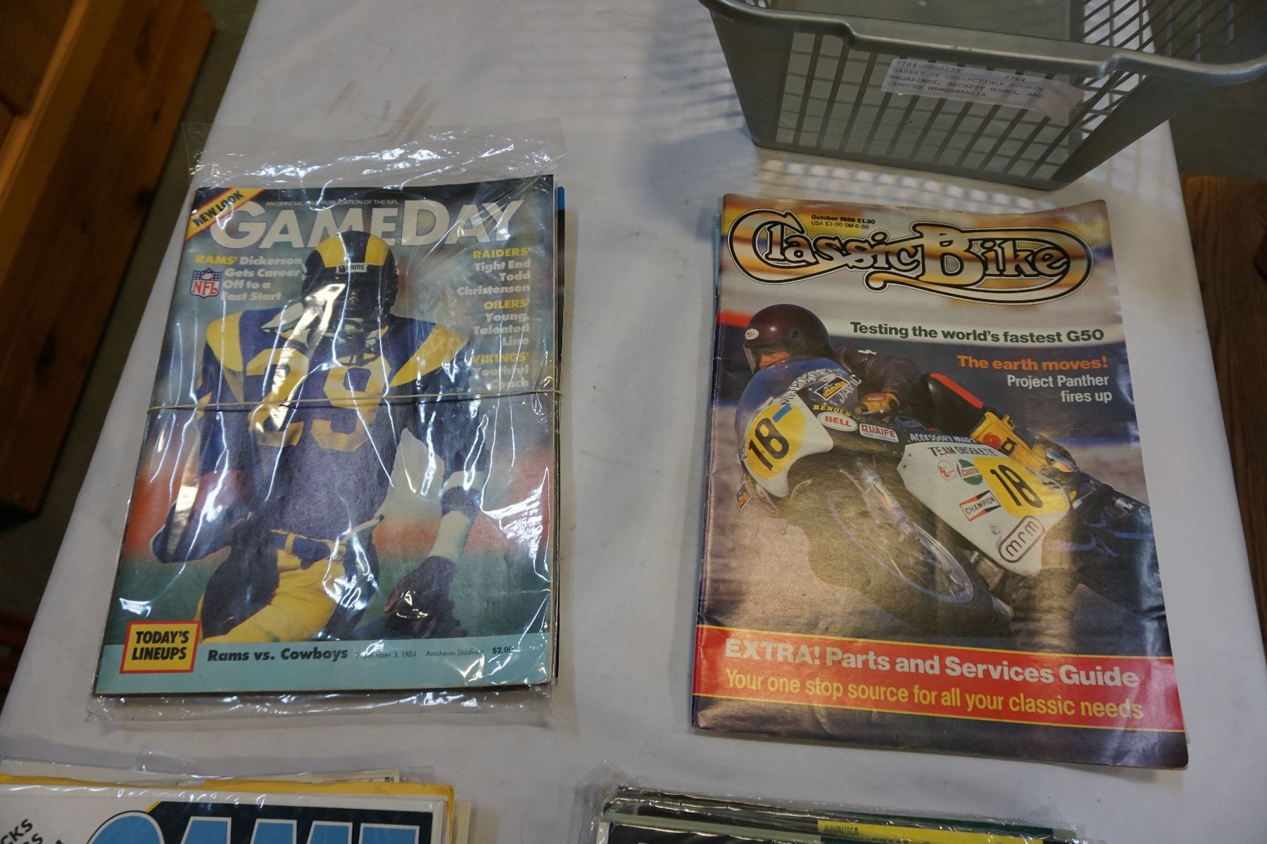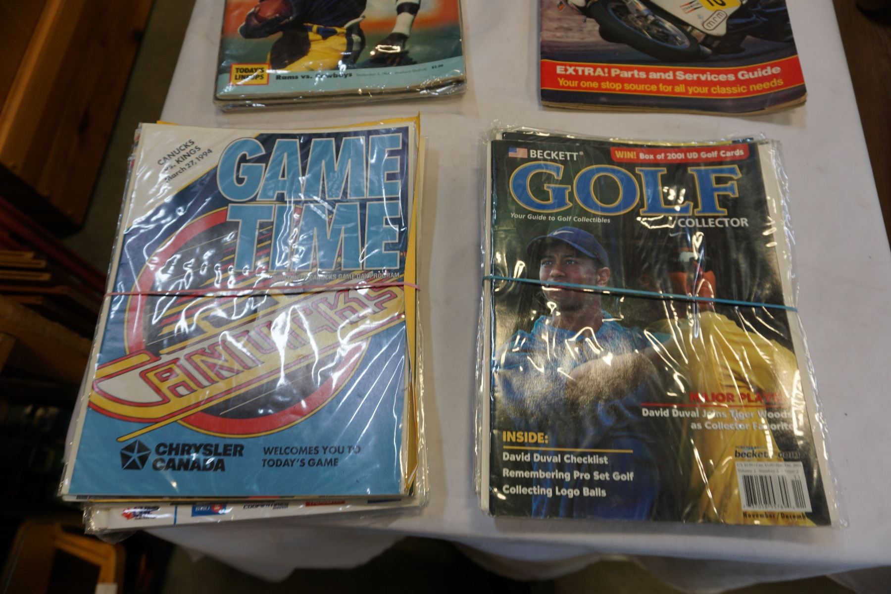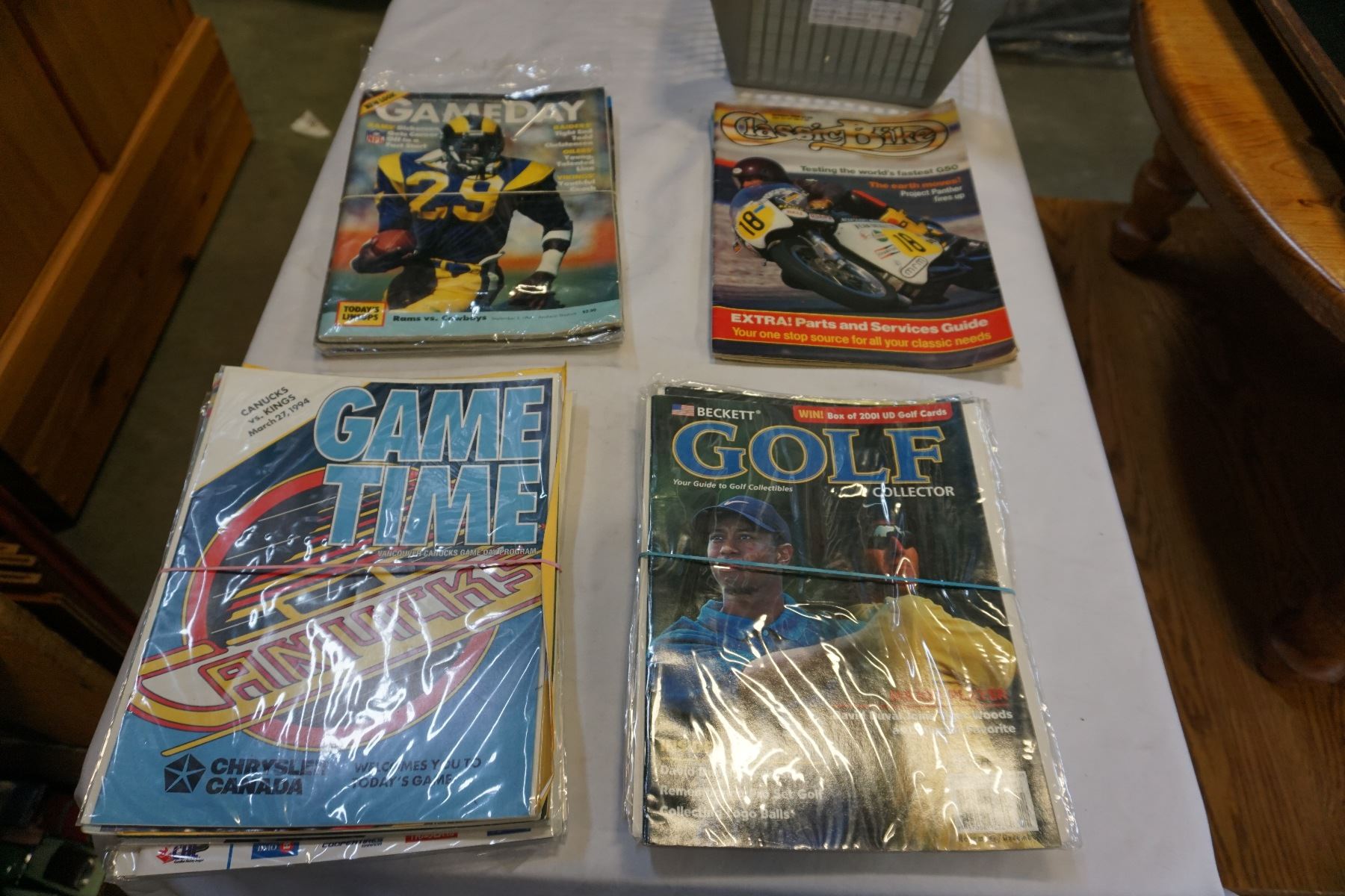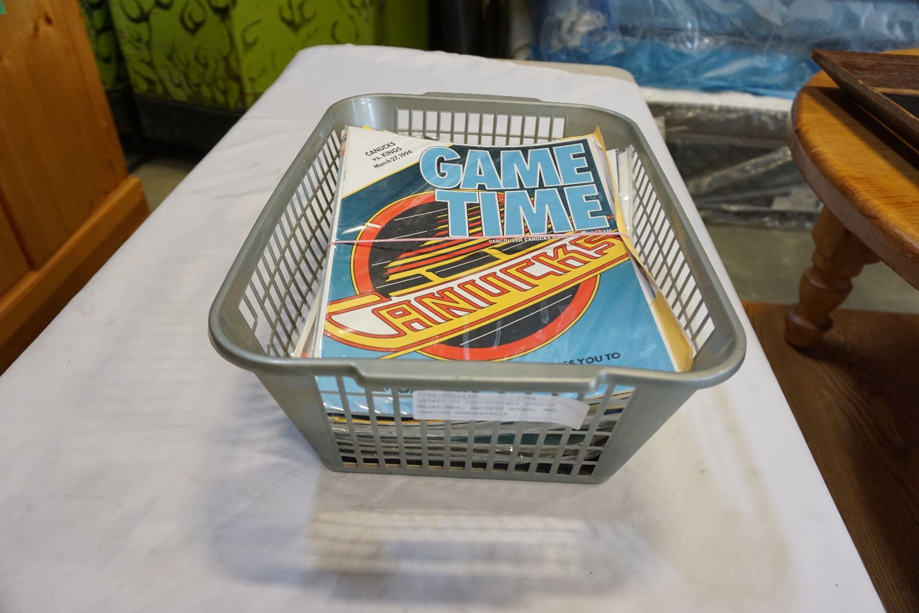 BASKET OF COLLECTIBLE SPORTS MAGAZINES, BECKETT BOOKS, AND CANUCKS MEMORBABLIA