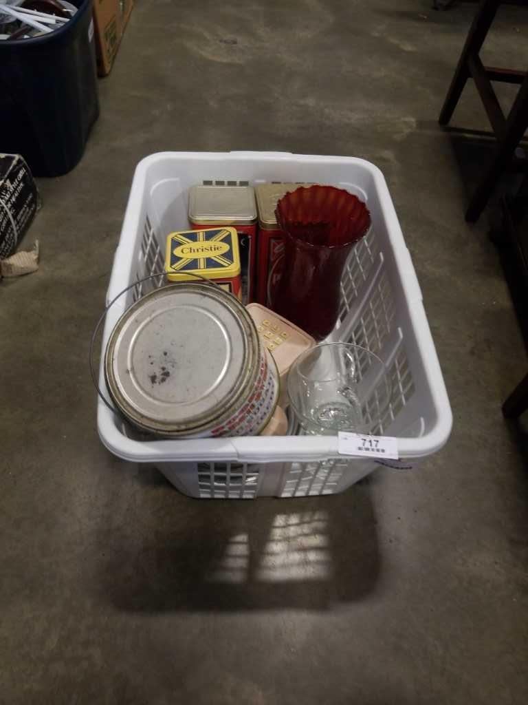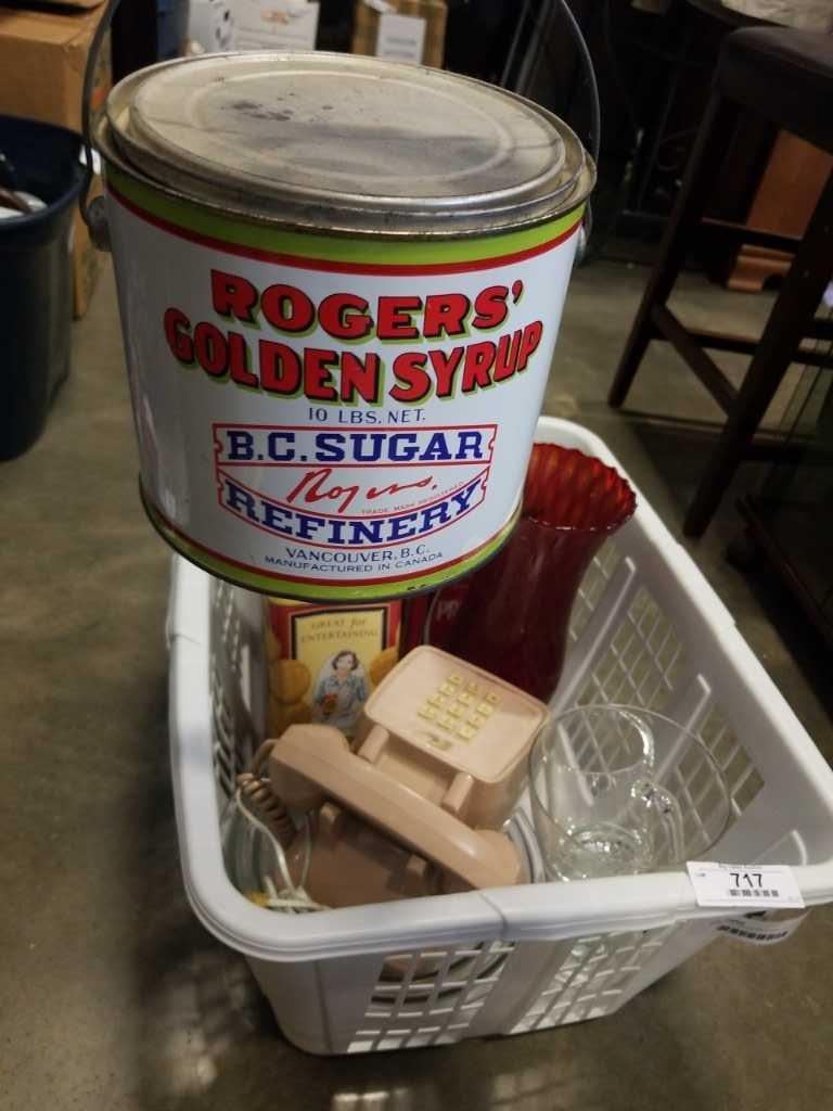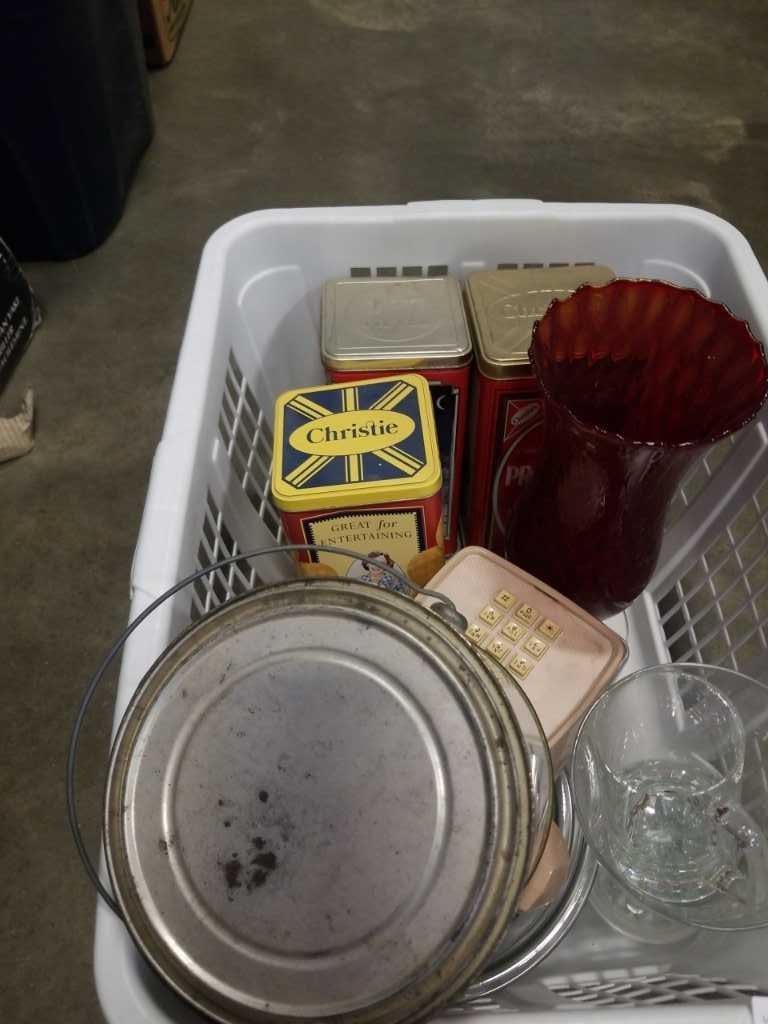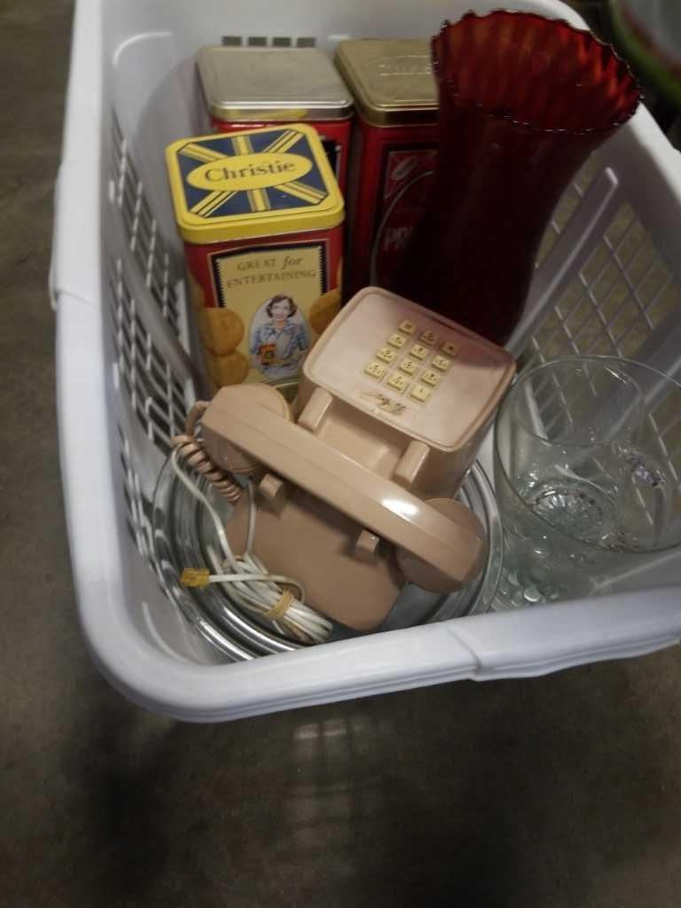 BASKET OF COLLECTIBLE TINS, VINTAGE PHONE, AND RUBY GLASS